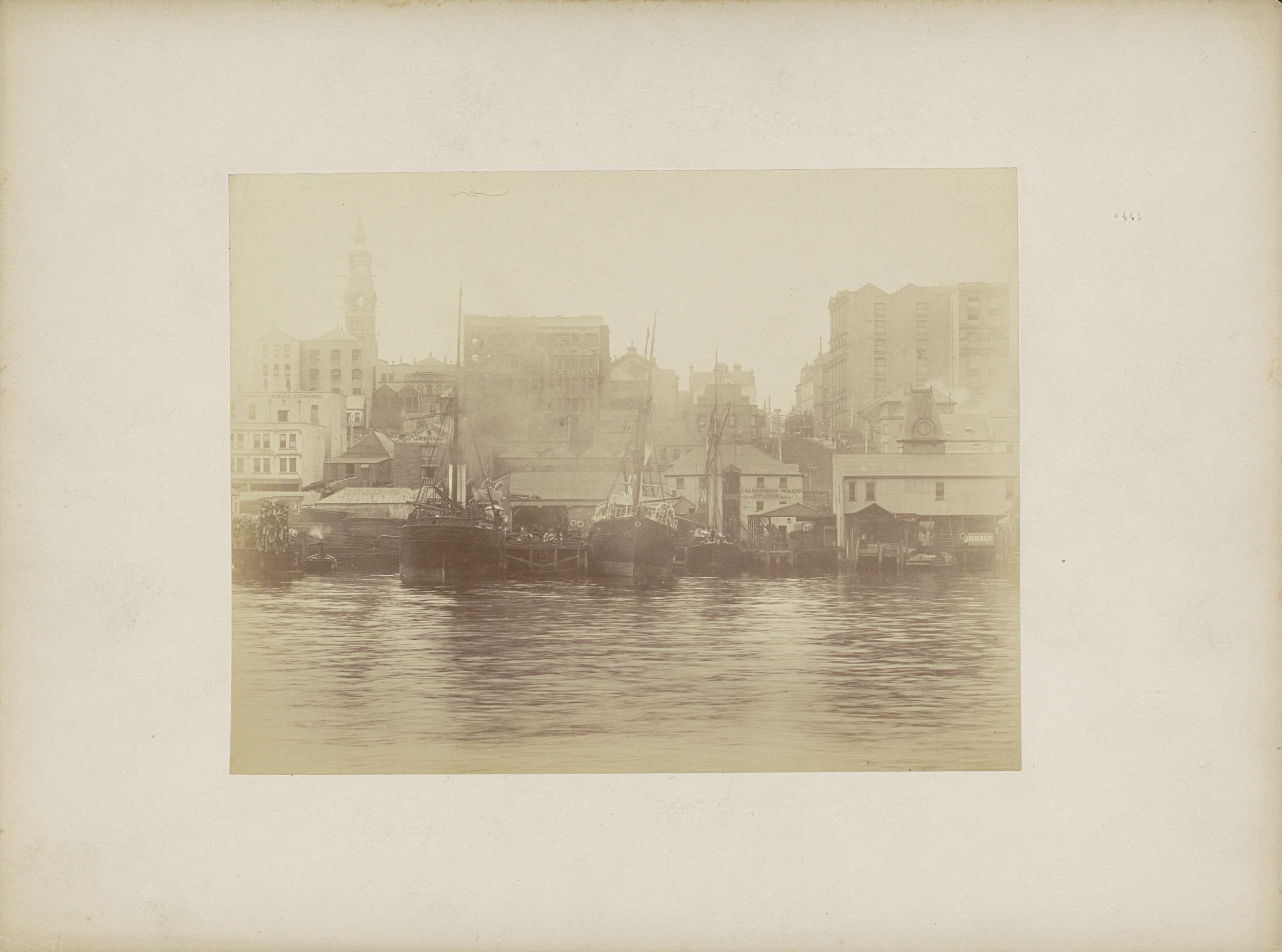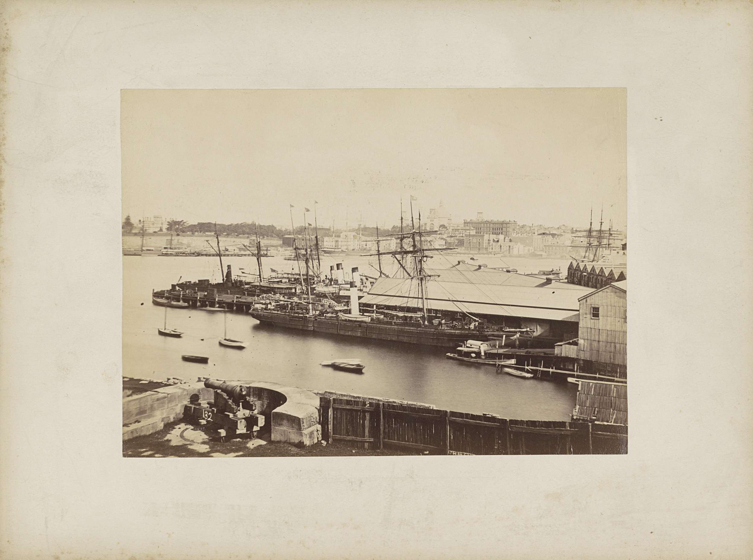 Boten aan de kade in de haven van (vermoedelijk) Sydney