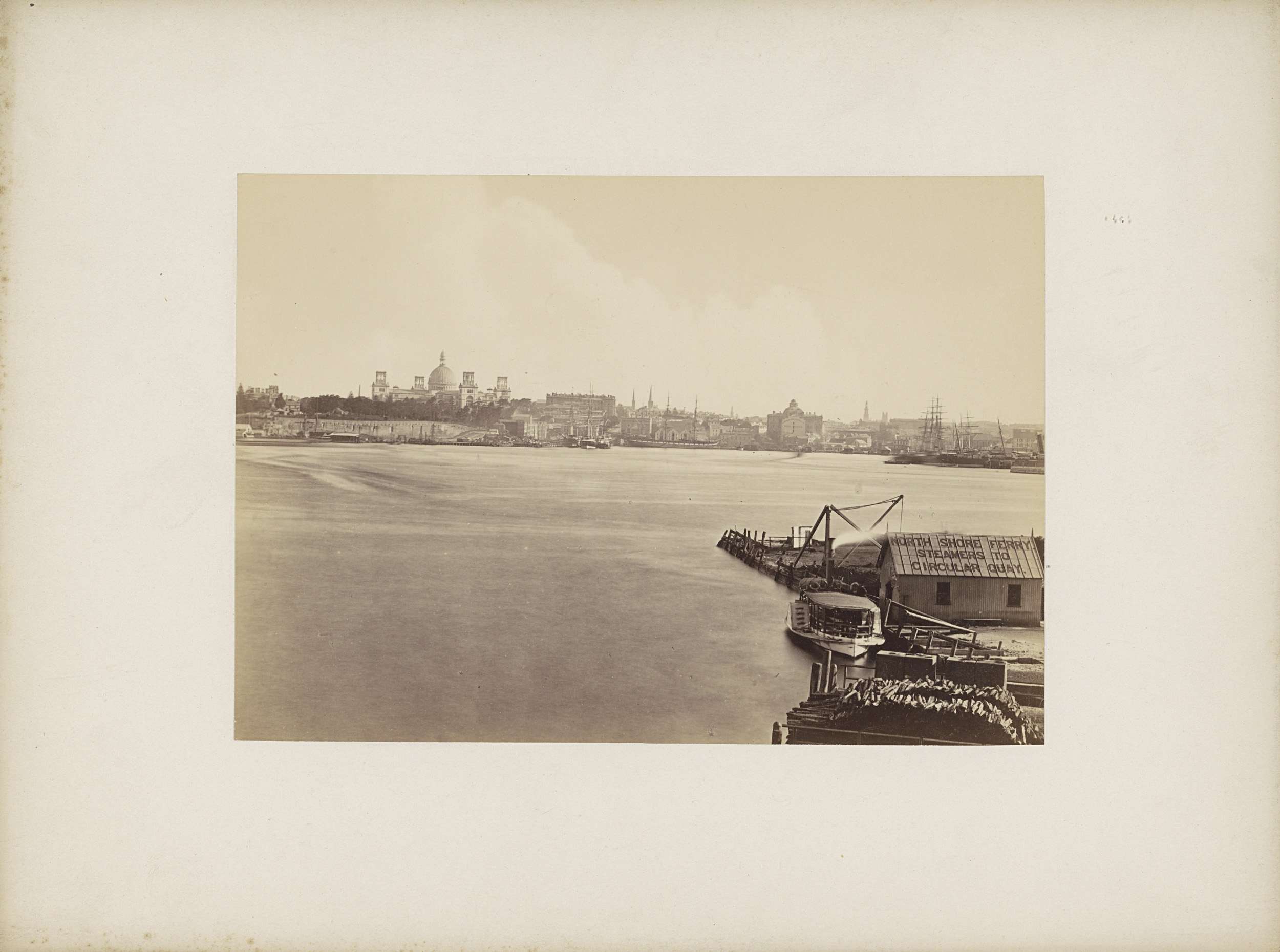 Gezicht op de haven van (vermoedelijk) Sydney met op...