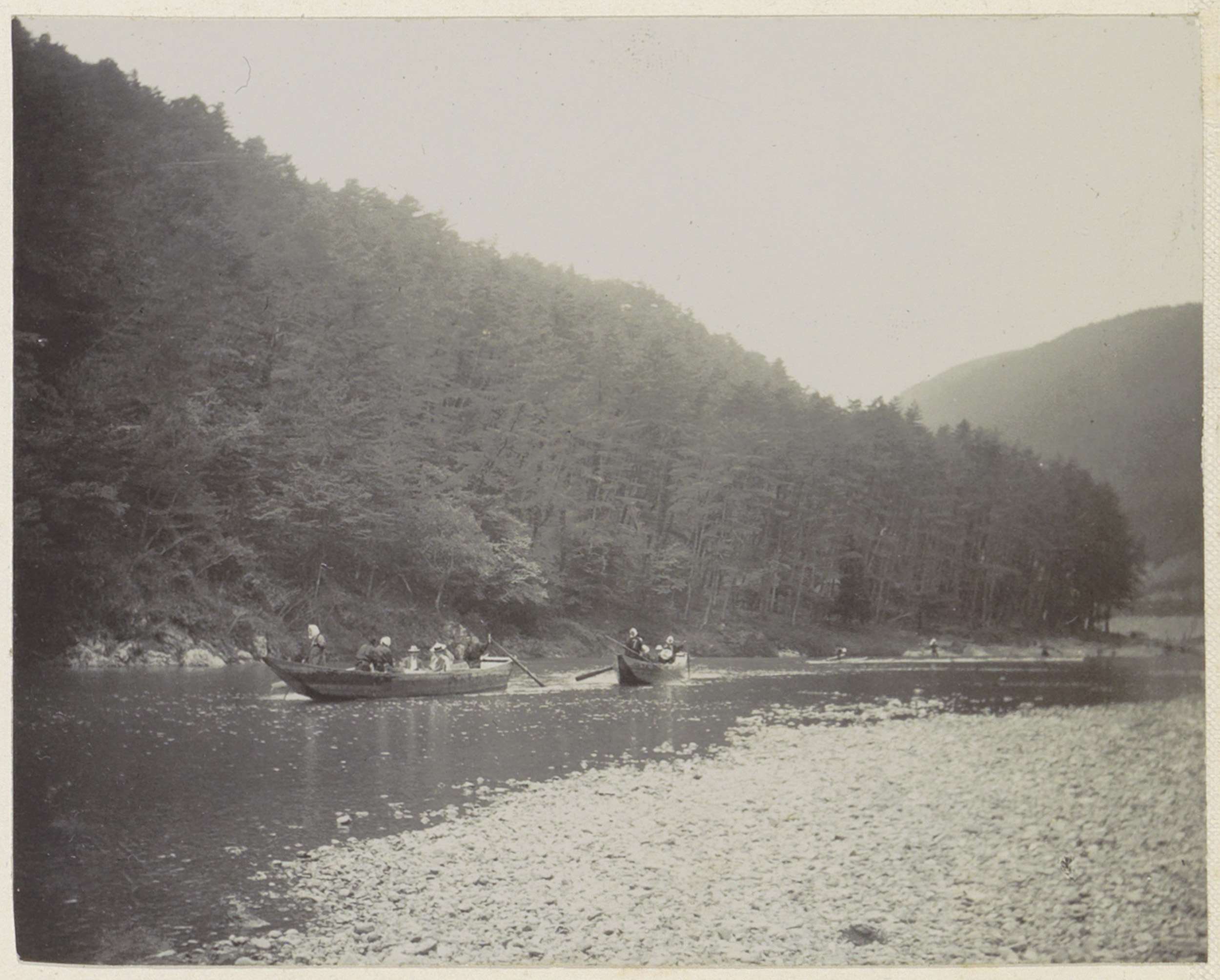 Twee boten met (vermoedelijk) Europeanen op een rivi...