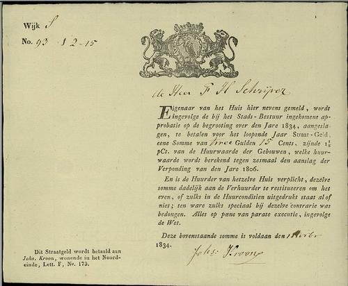 Aanslagbiljet, straatgeld, 1834
