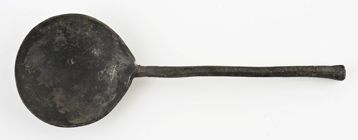 Tinnen lepel, ronde bak en zeskantige steel, gemerkt
