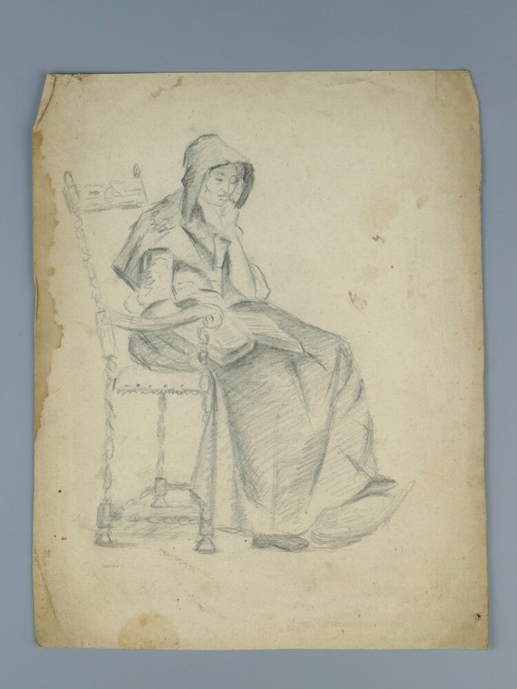 Potloodtekening voorstellende vrouw op stoel, ca. 1870.