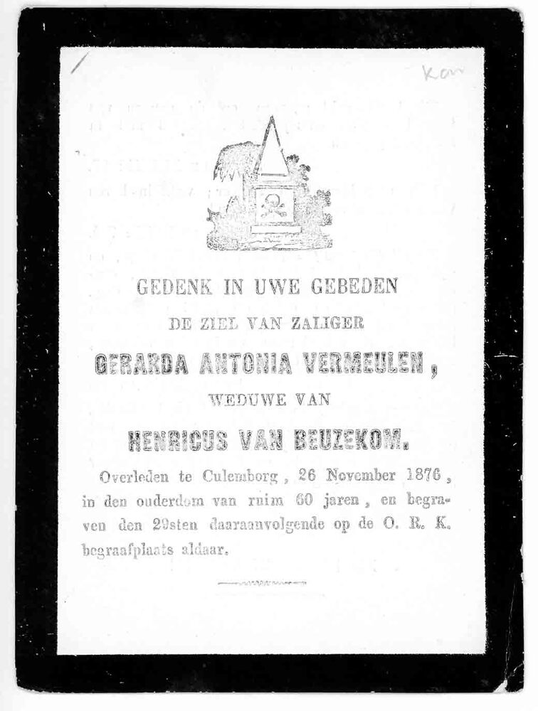 bidprent voor Gerarda Antonia Vermeulen. Geboren 181...