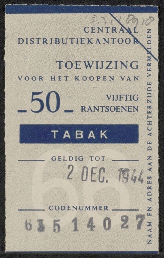 toewijzing 50 rantsoenen tabak, geldig tot 1 decembe...
