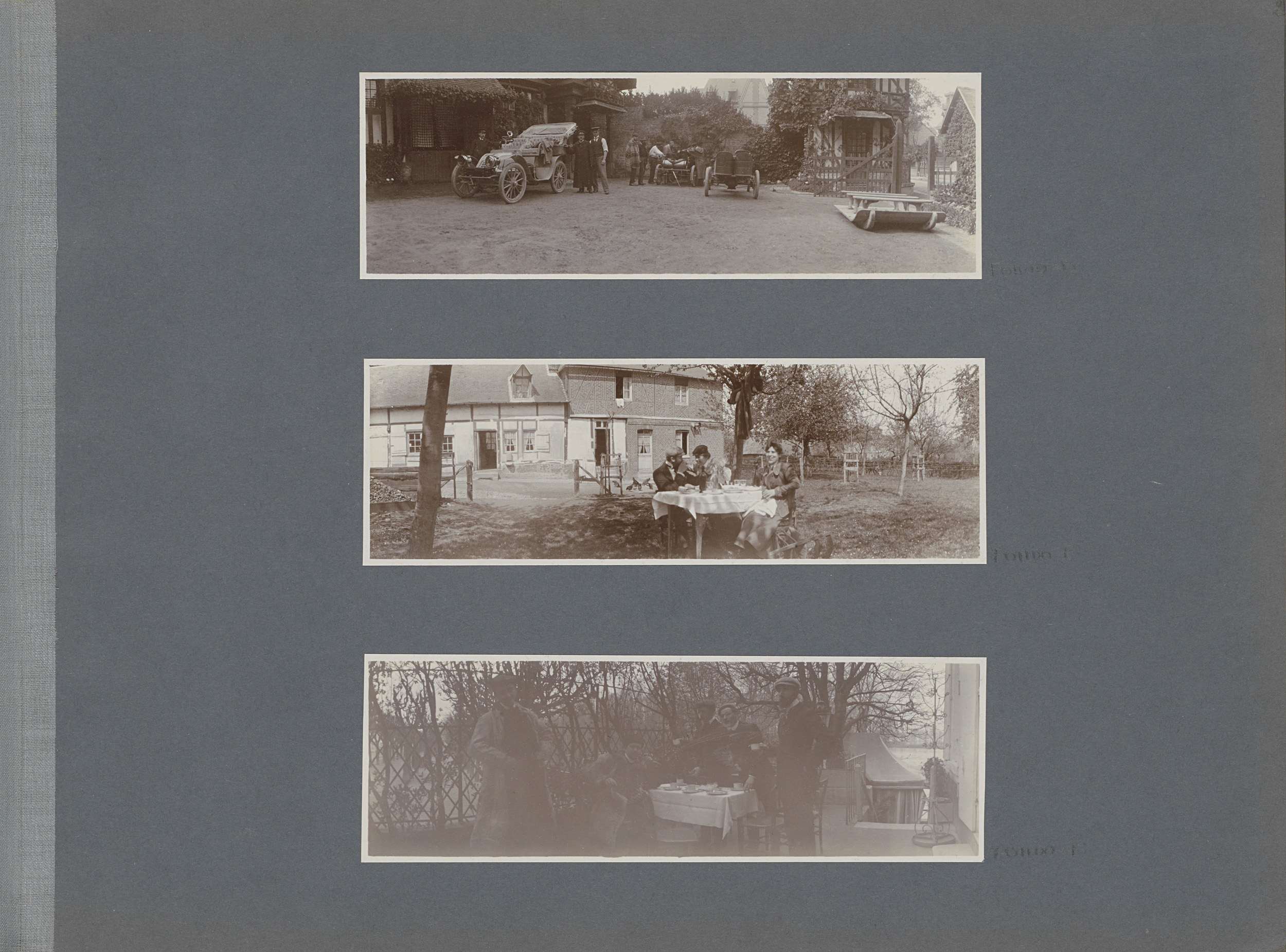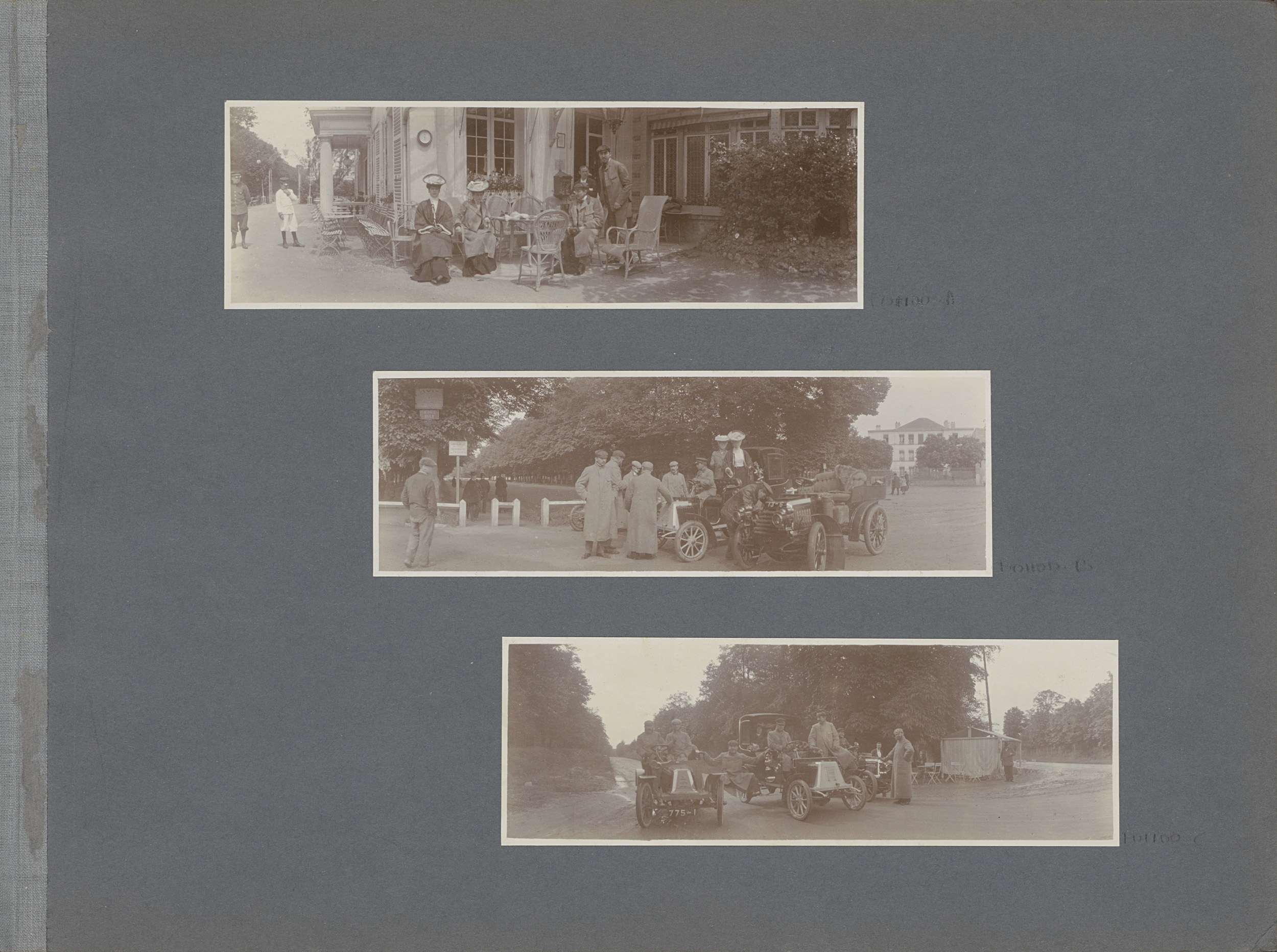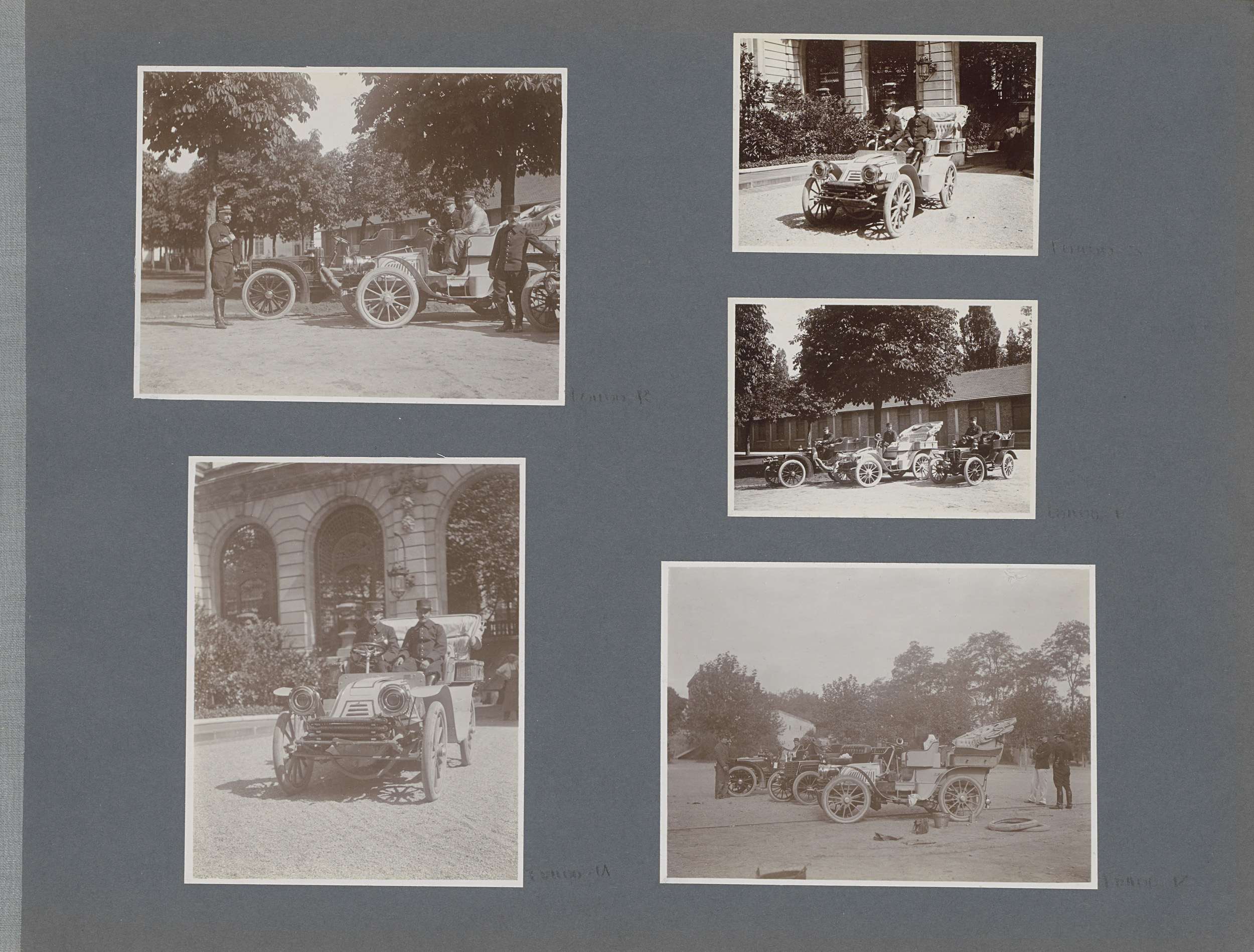Mannen bij auto's in Frankrijk, rechts een slee