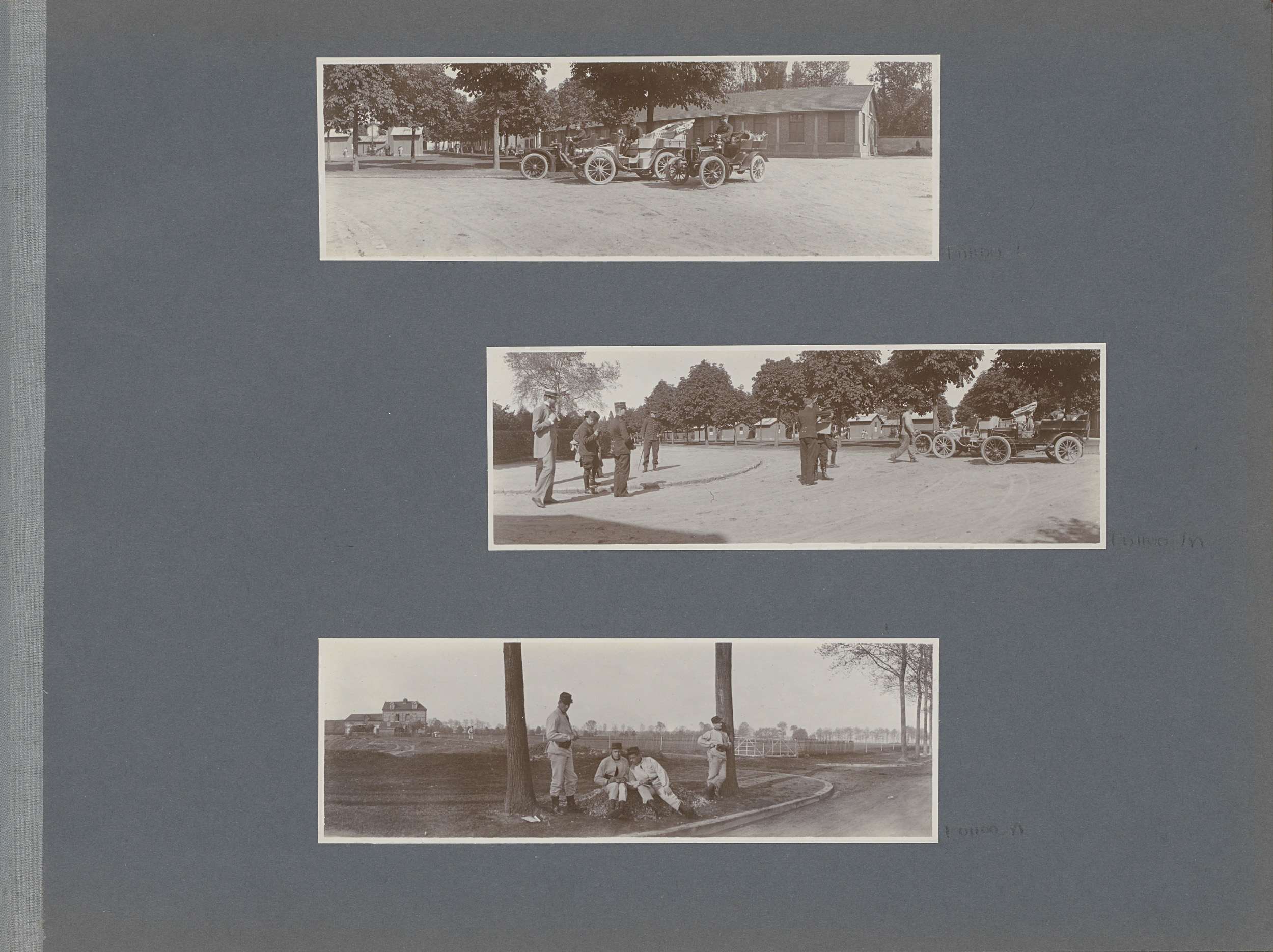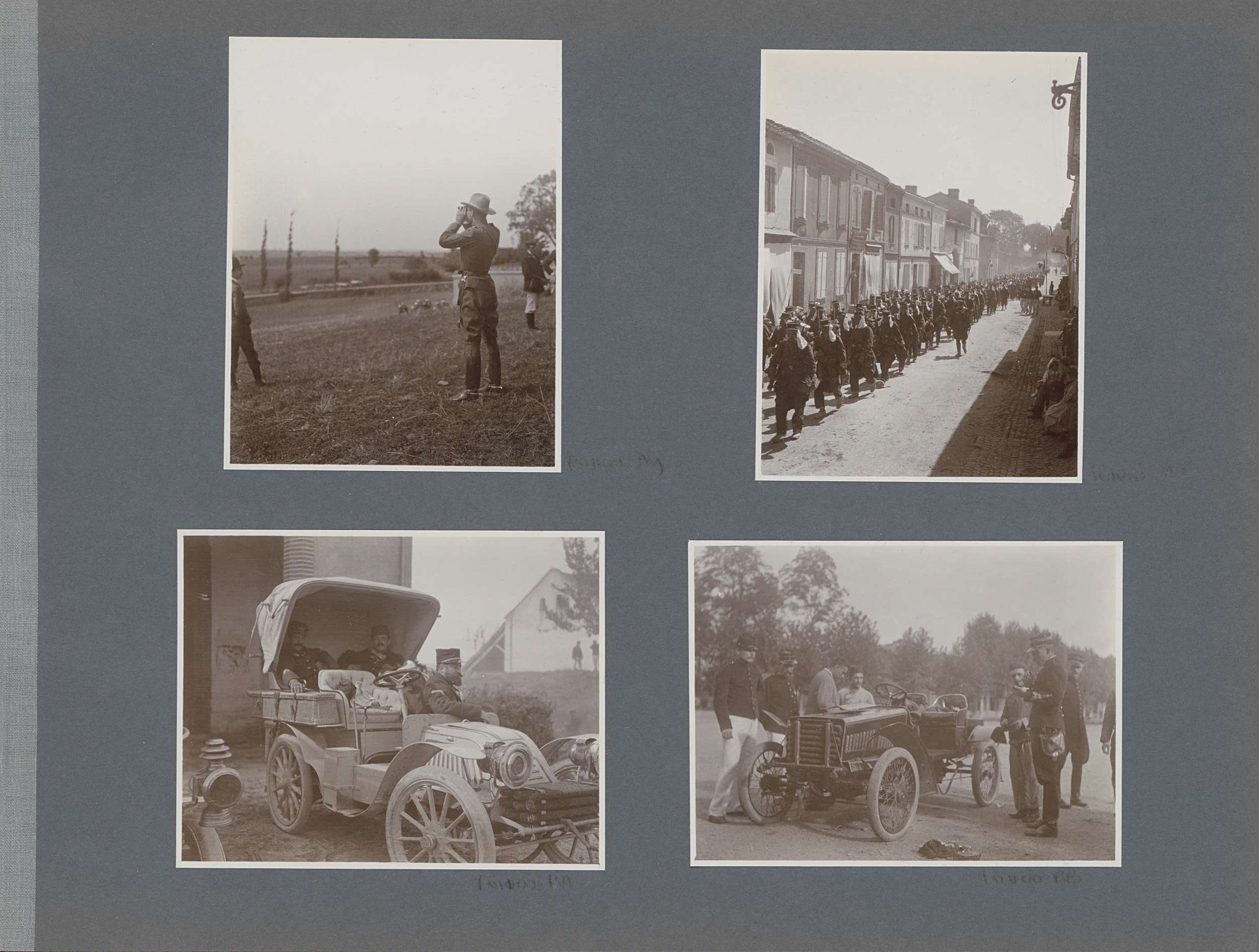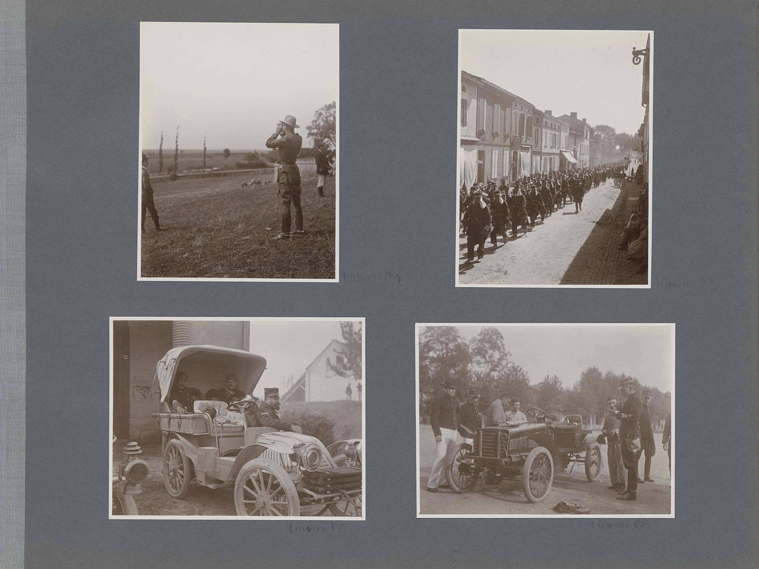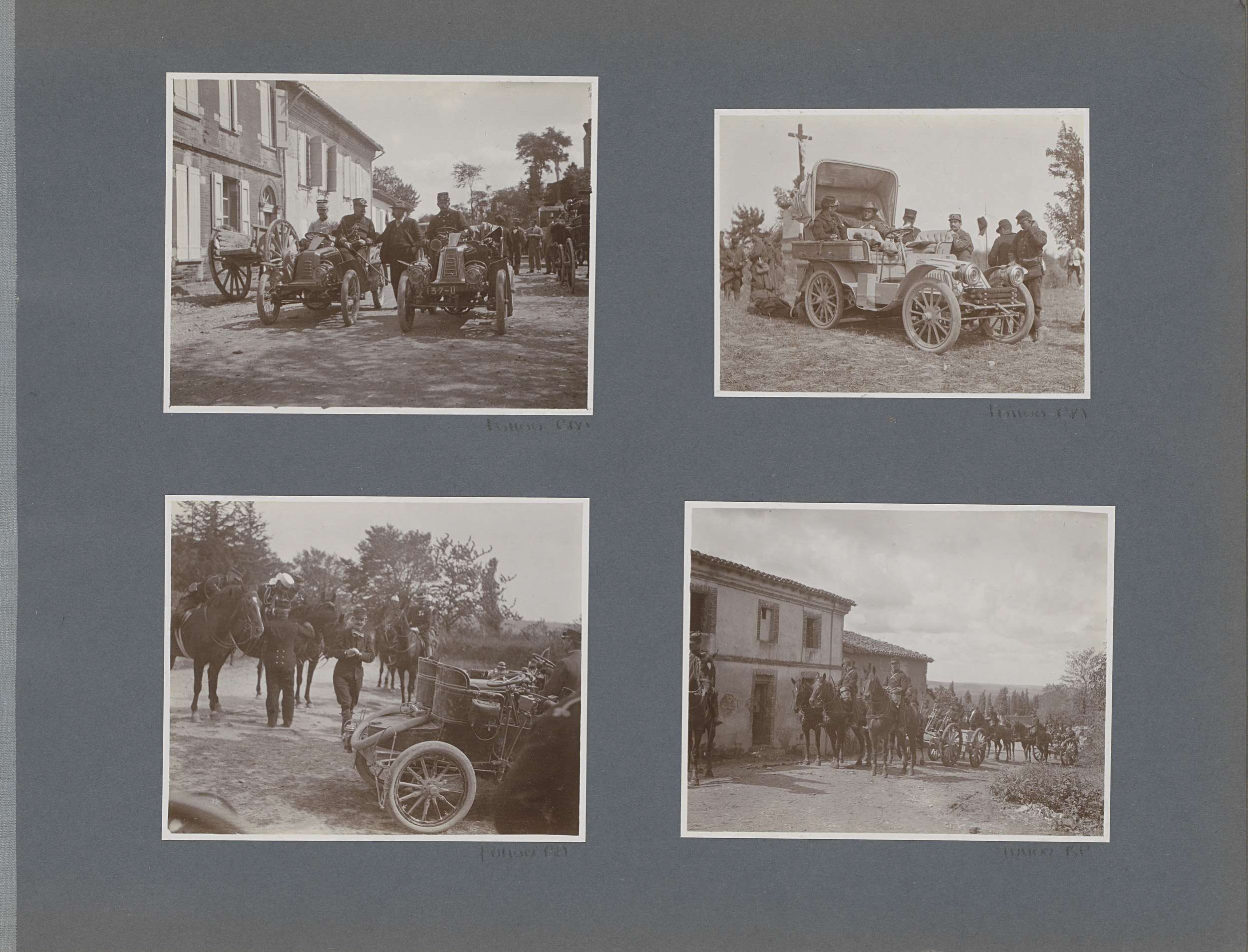 Militairen bij auto's in Frankrijk, op de achtergron...