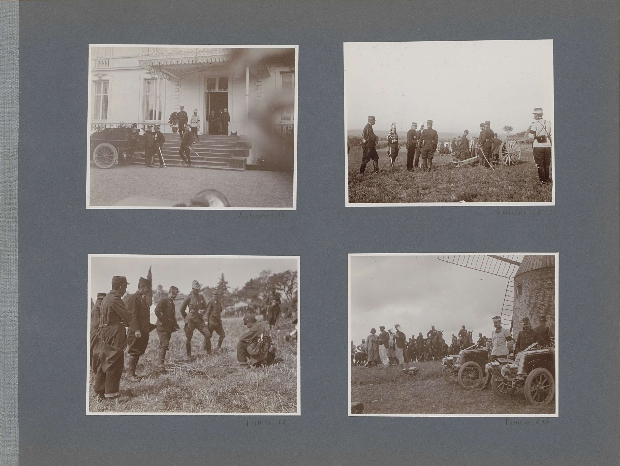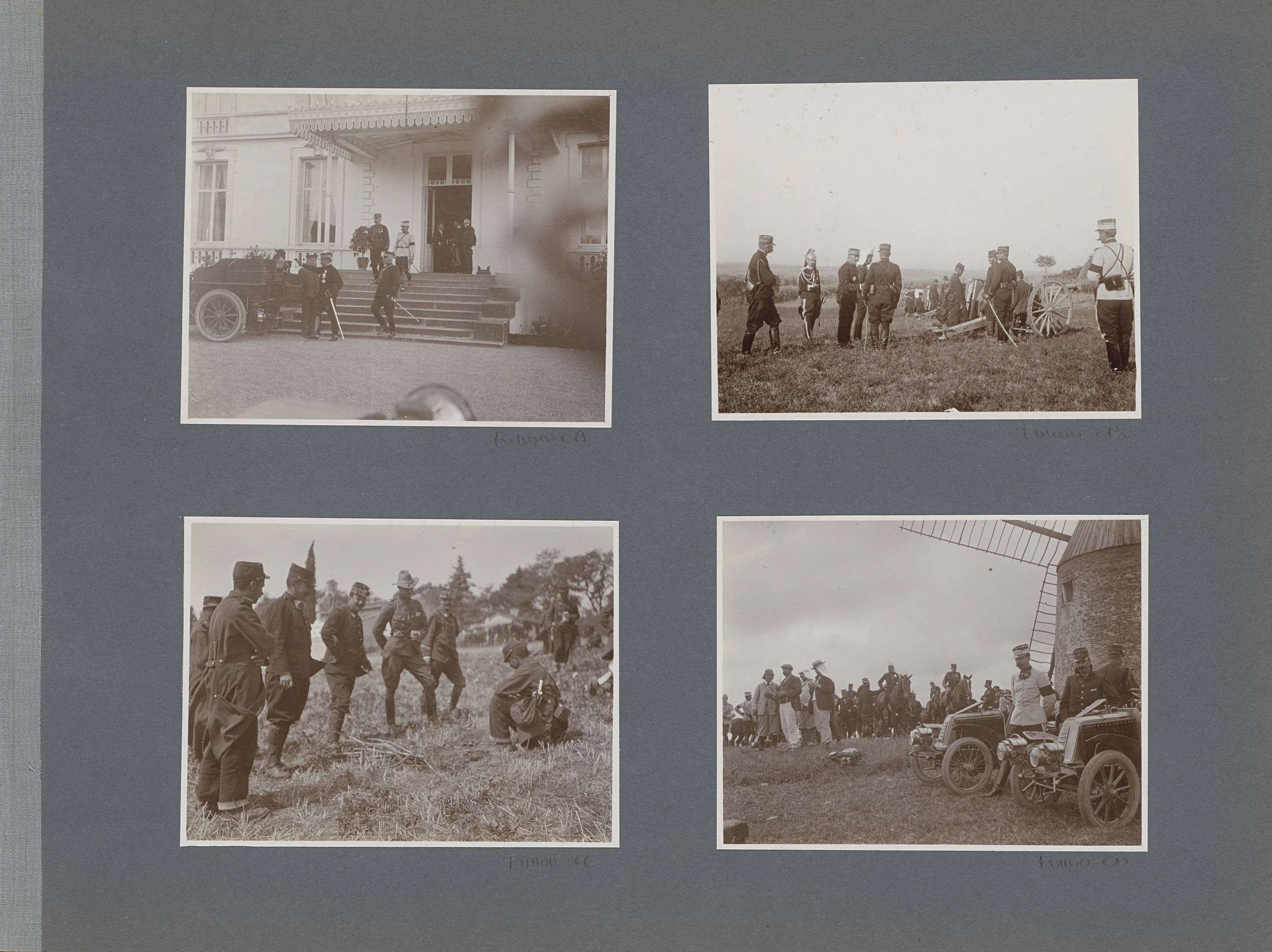 Militairen, auto's en paarden bij een molen in Frank...