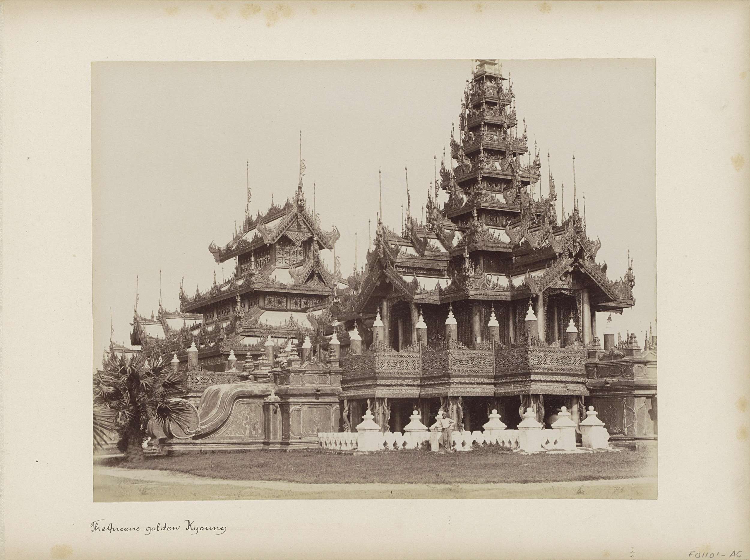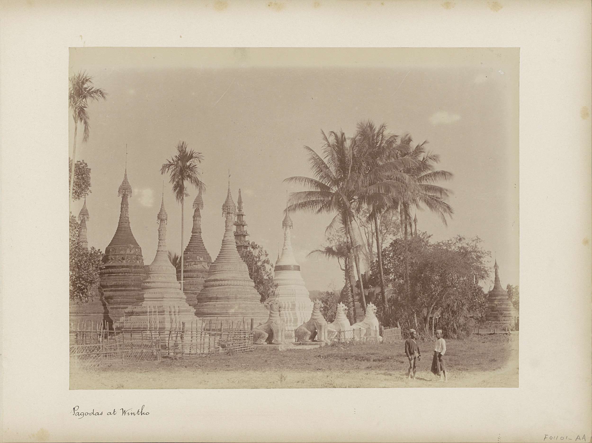 Two Burmese men posing by the pagodas and lion statu...