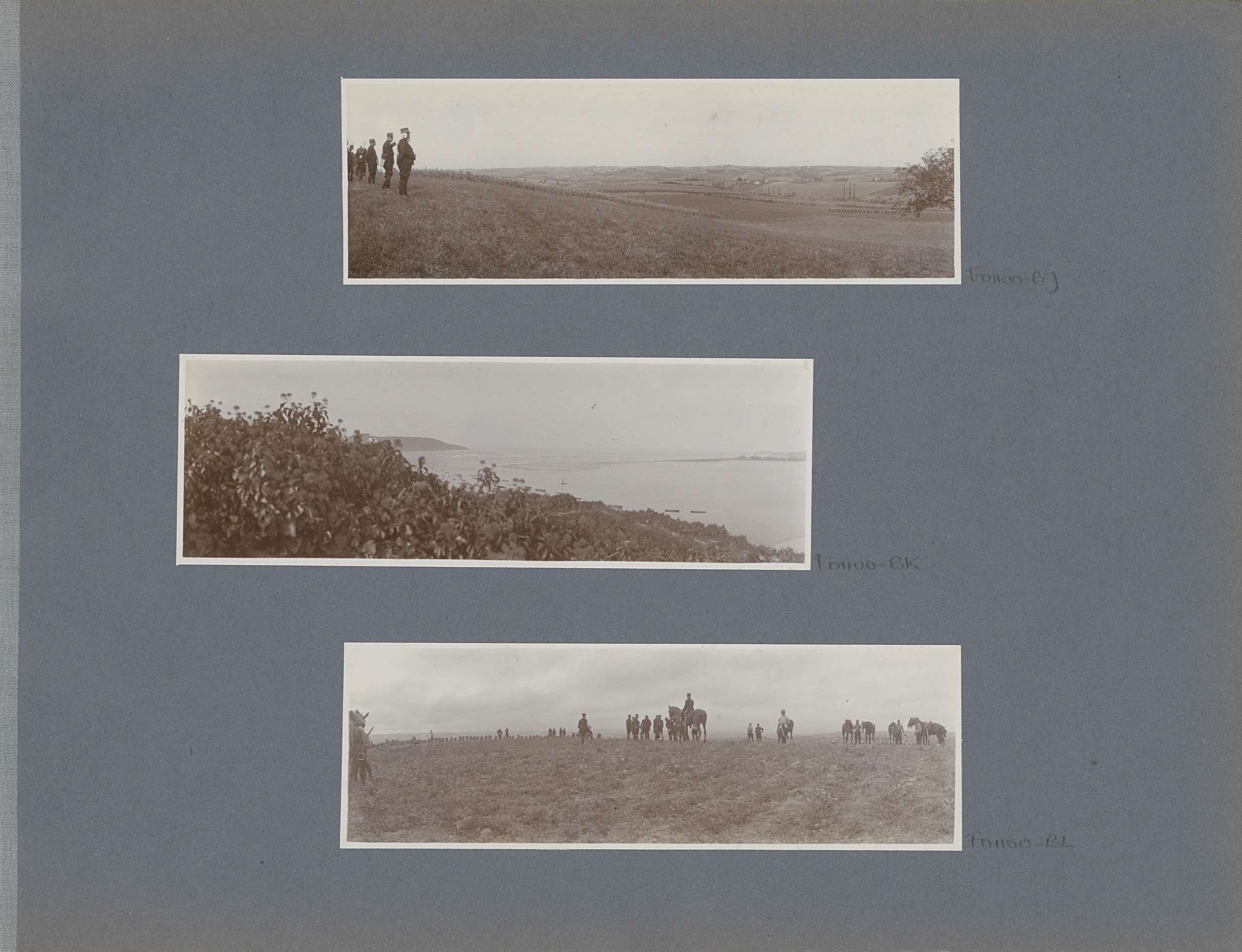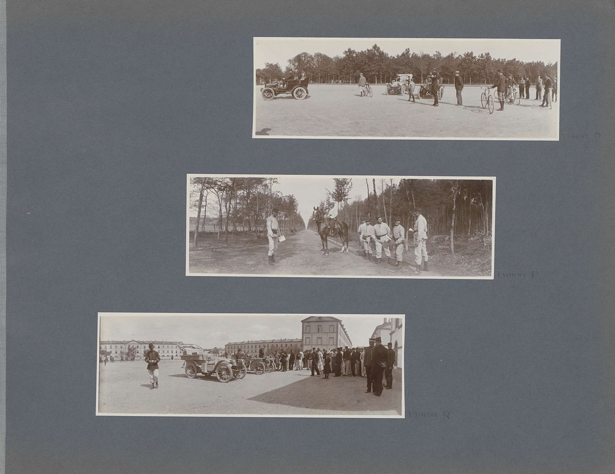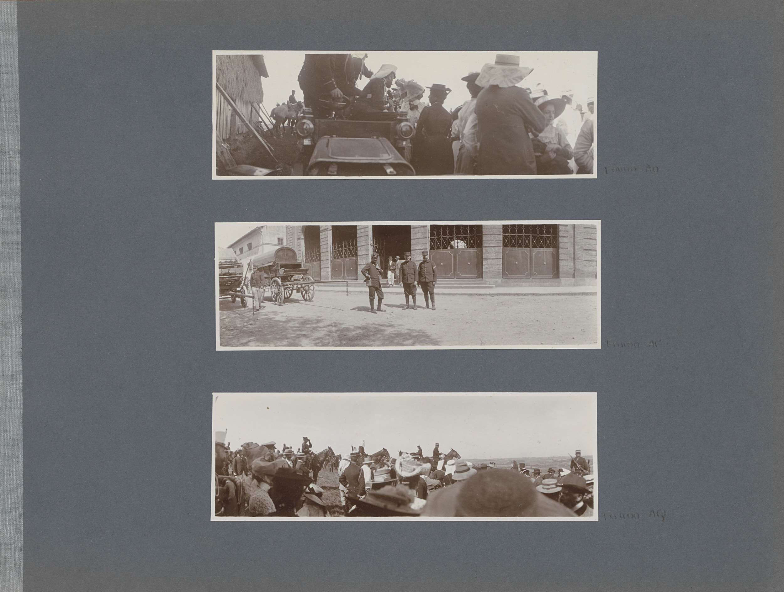 Twee auto's en militairen te paard op een heuvel in ...