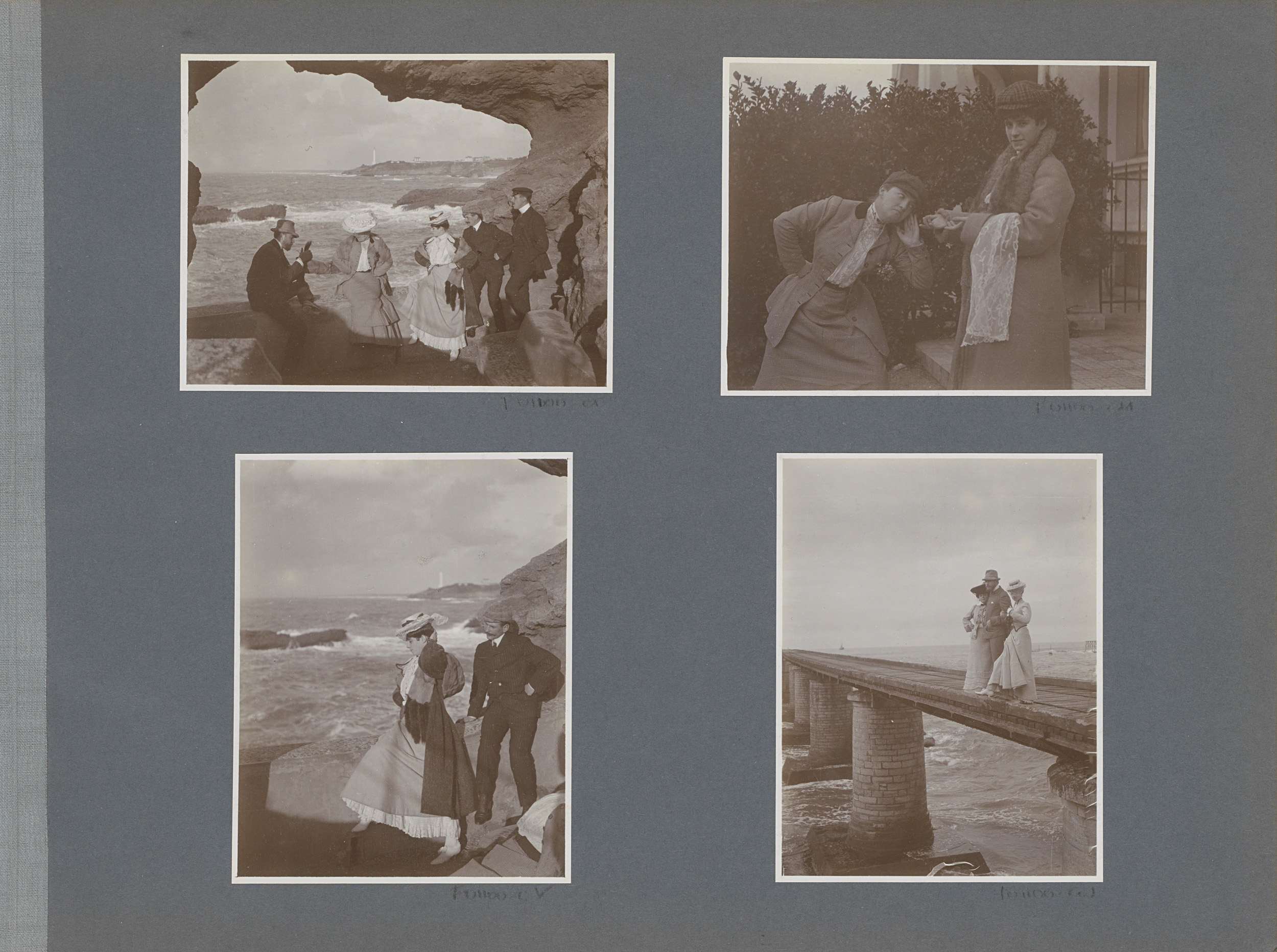 Vier mannen en vrouwen bij een pier in zee aan de Fr...
