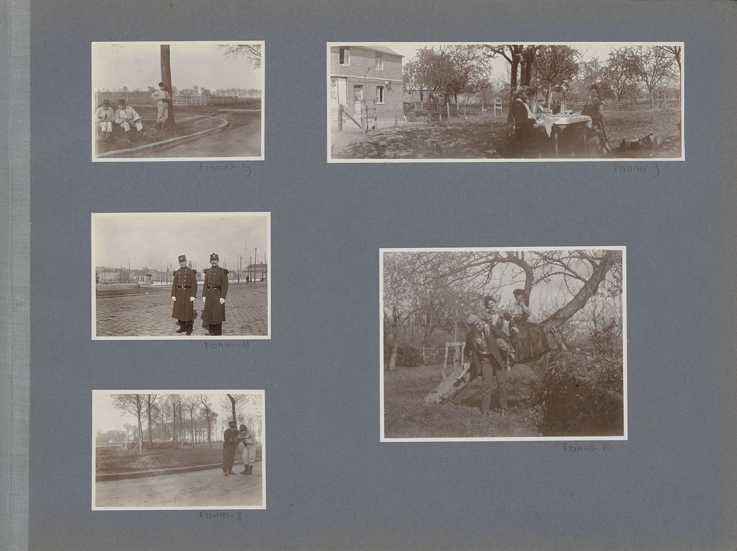 Twee militairen in lange jassen op een klinkerstraat...