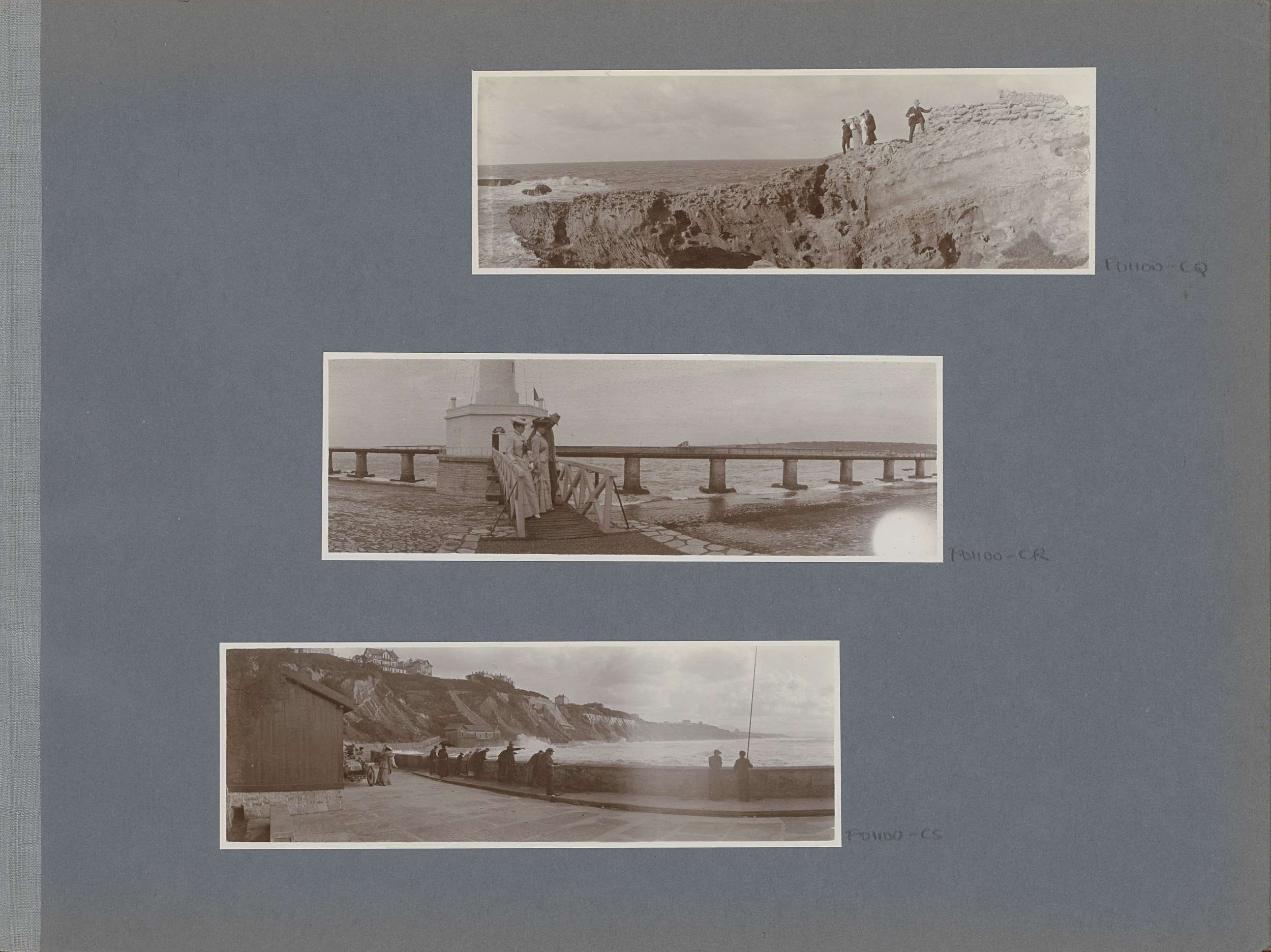 Twee vrouwen en een man op een pier aan de Franse kust