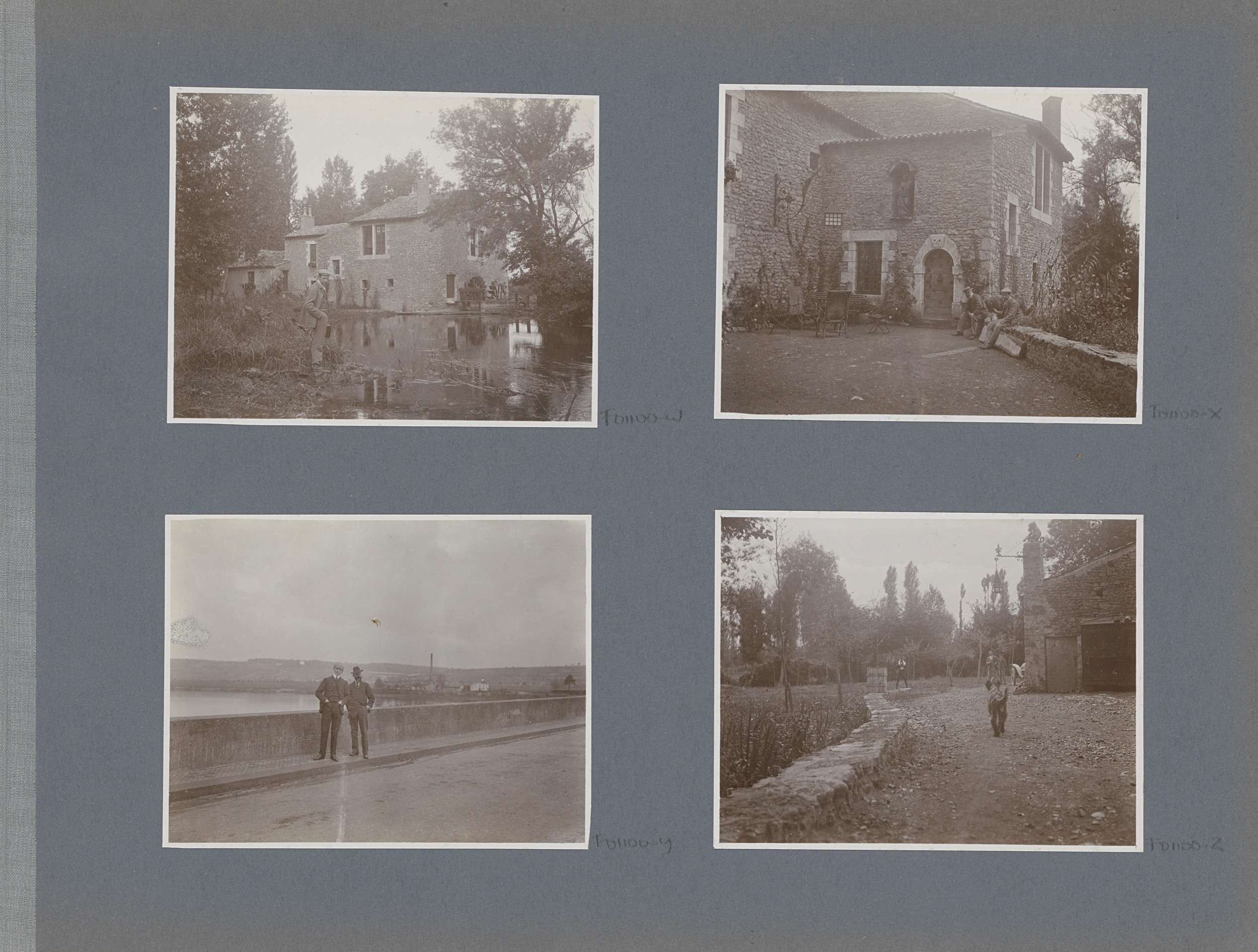 Hond en mannen op een erf in Frankrijk, één man foto...
