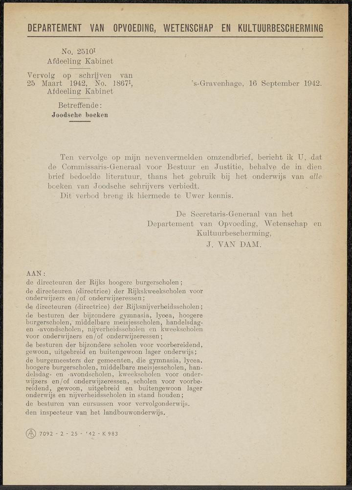Brief van het Departement van Opvoeding, Wetenschap ...