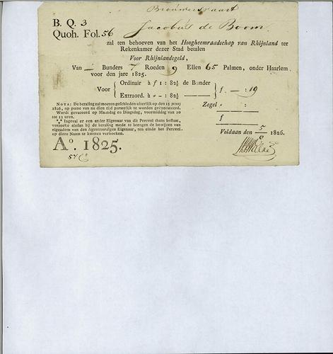 Aanslagbiljet, grondbelasting, 1825