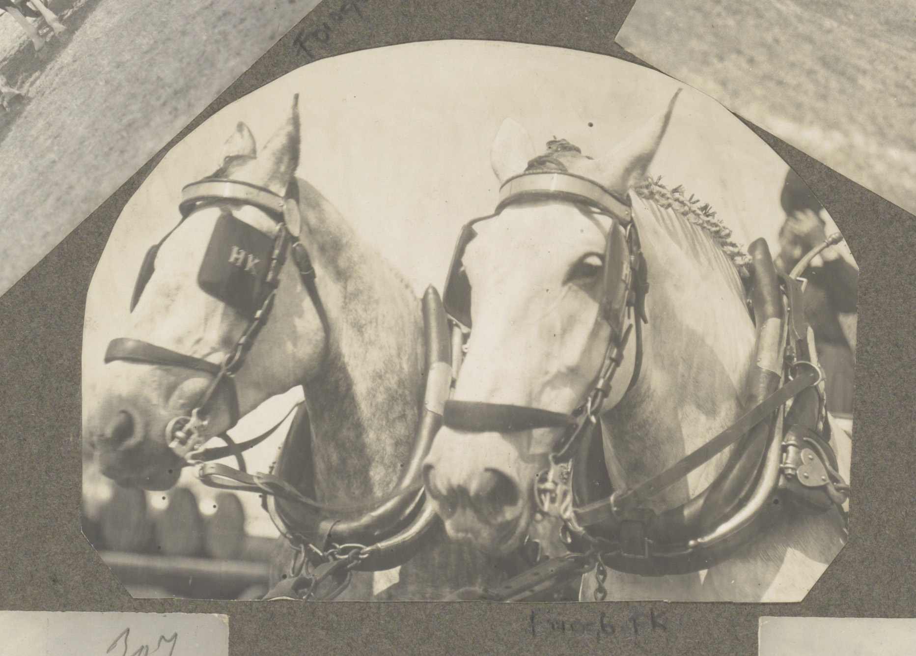 Twee paardenhoofden met oogkleppen tijdens de eerste...