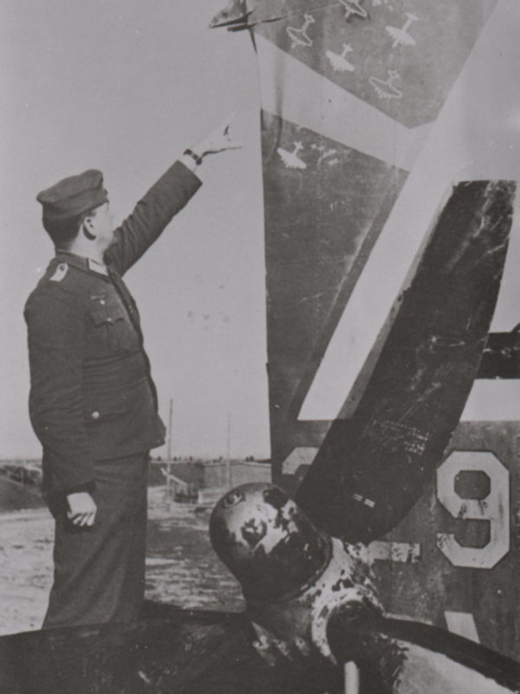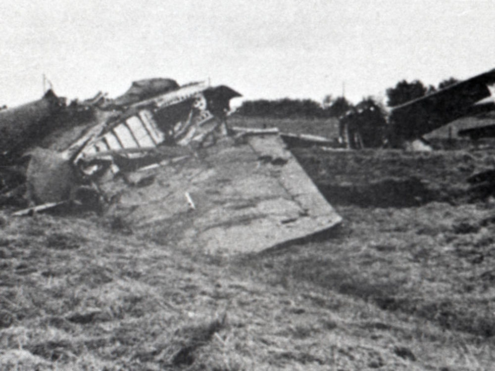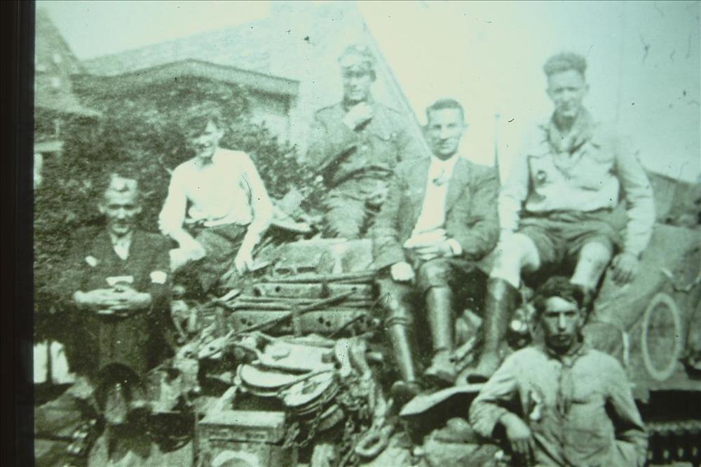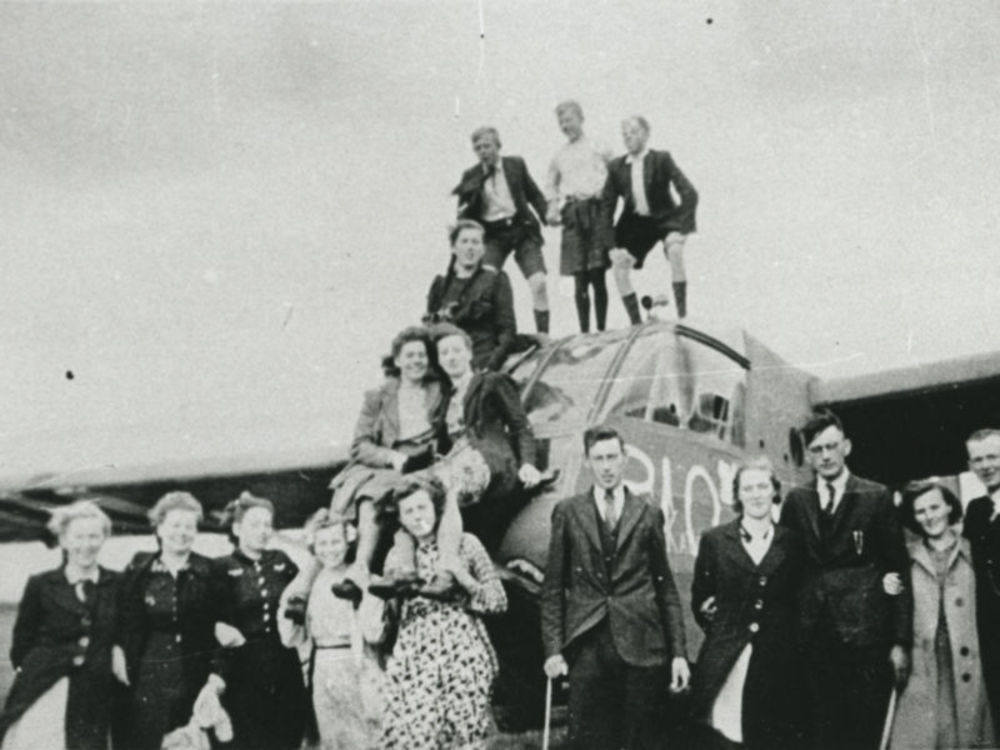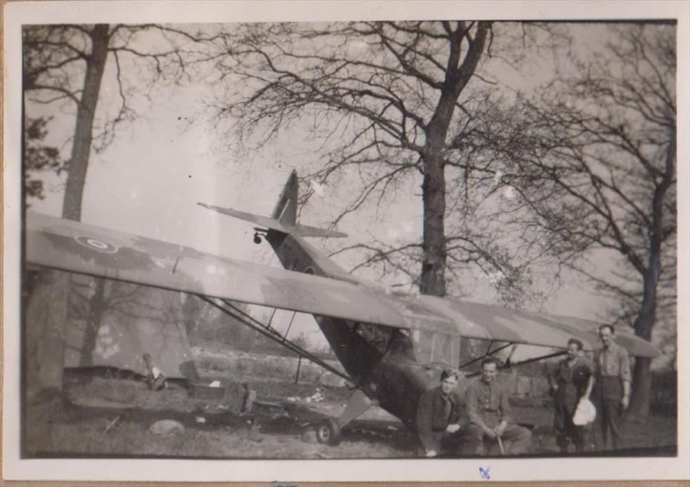 Foto van vier militairen bij een eenmotorig vliegtuig.
