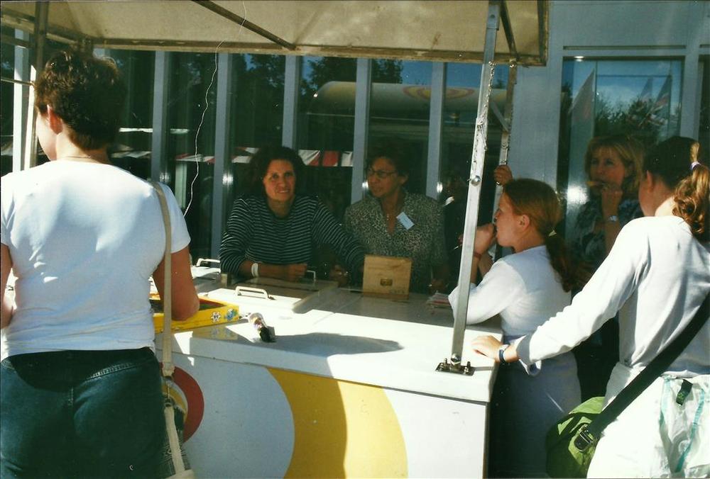 Foto van burgers voor en op de cockpit van een gelan...