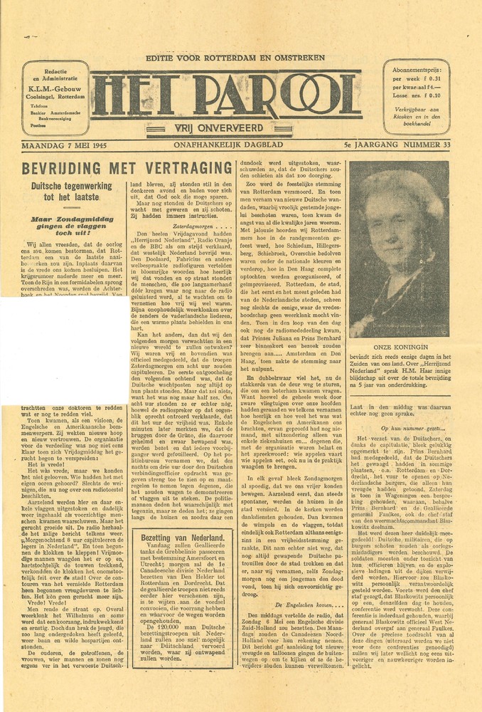 Het Parool 7 mei 1945 - bevrijding met vertraging