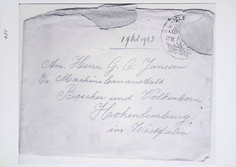 Brief in enveloppe. 19 oktober 1943. Aan den heer G....