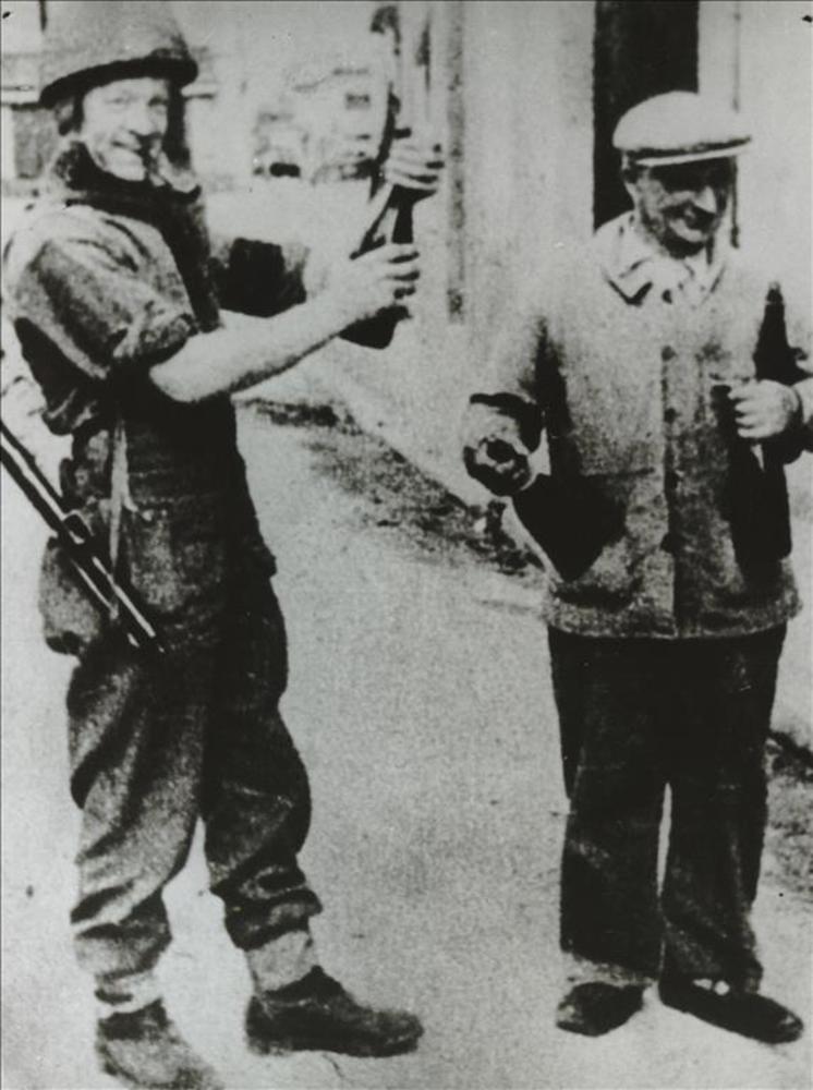 Boer geeft flessen drank aan soldaat van 1ste Gemoto...