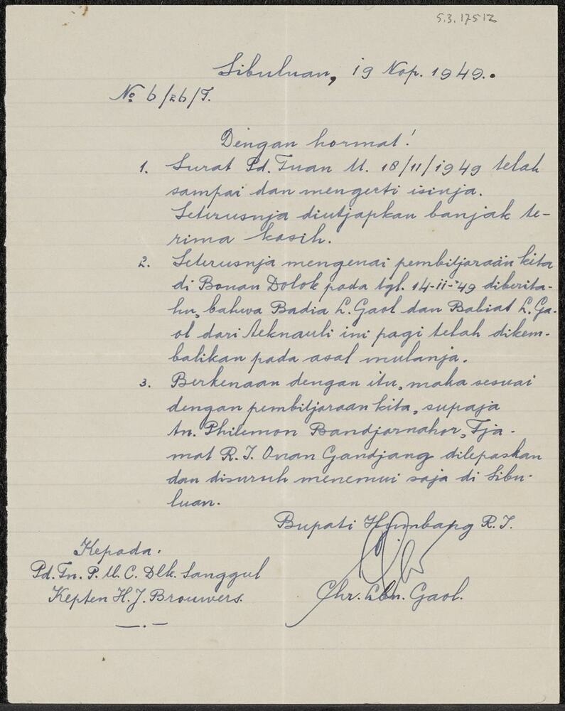 Brief in het maleis aan kapitein H.J. Brouwers, d.d....
