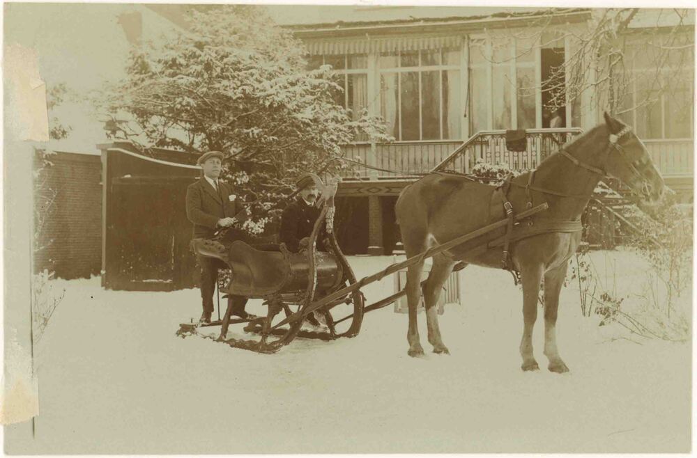 Foto, voorstellende arrenslee, achter huis van Dress...