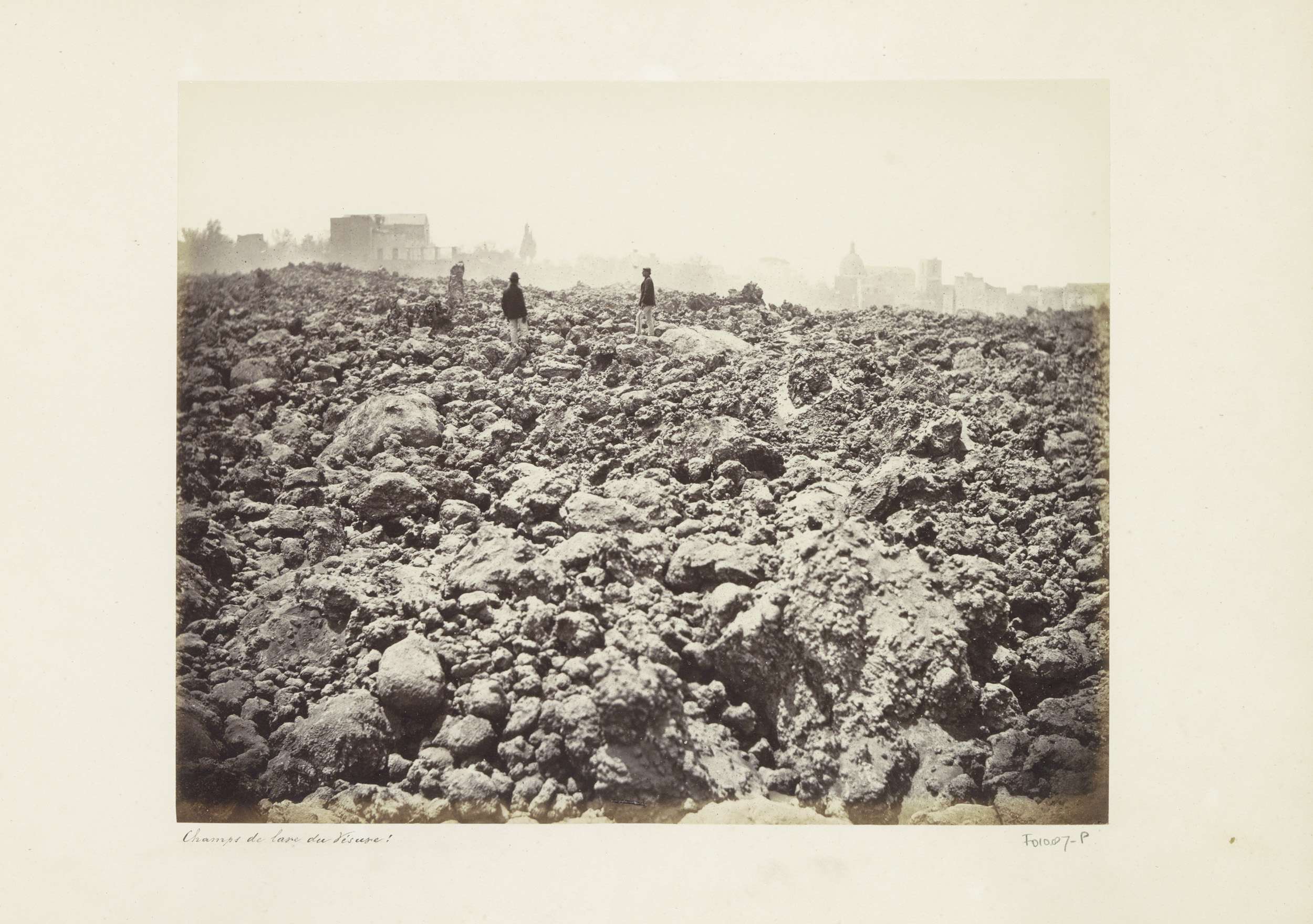 Twee mannen lopend op lava van de Vesuvius bij Napels