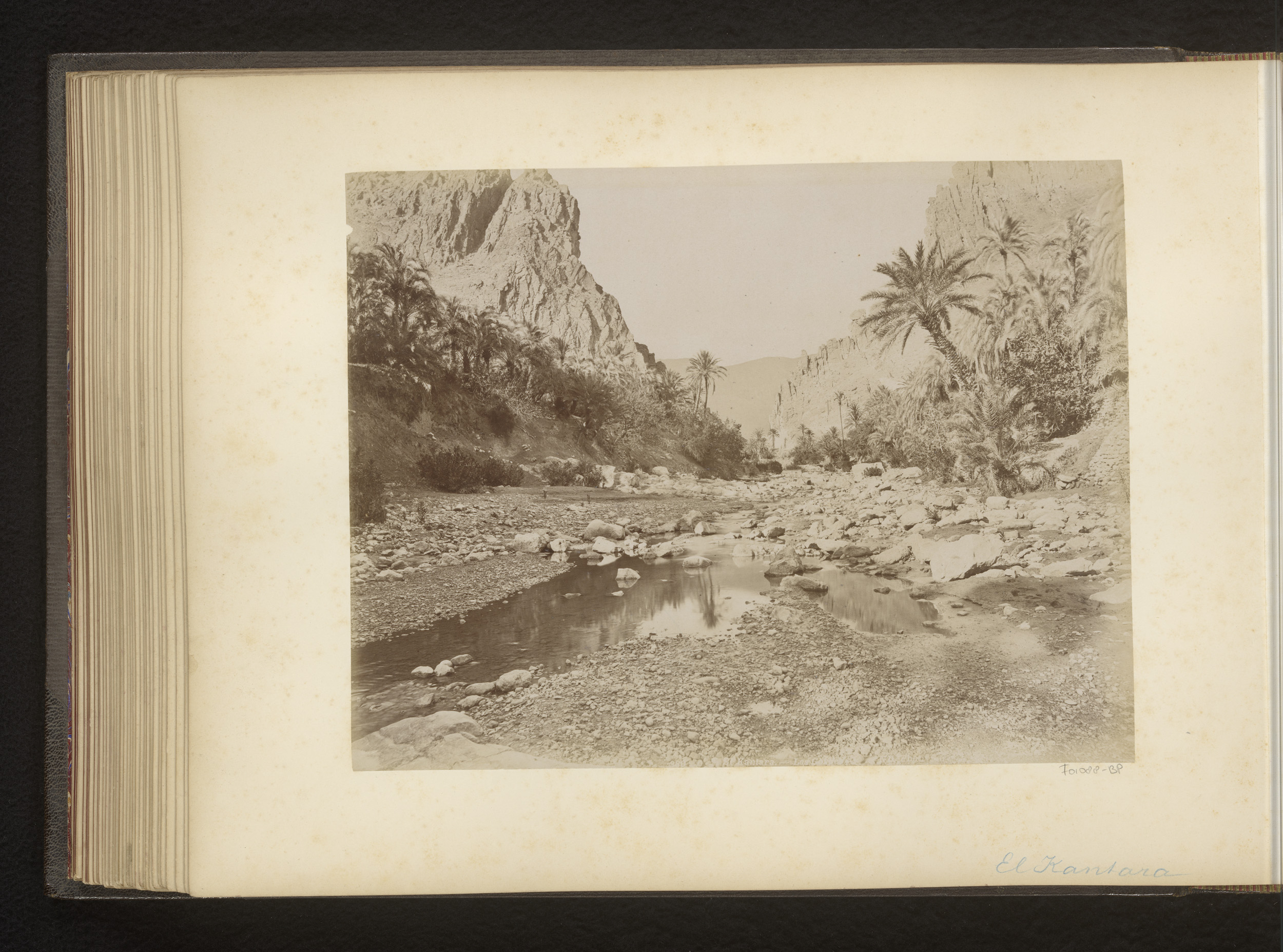 Rivierbedding met rotsen en palmen