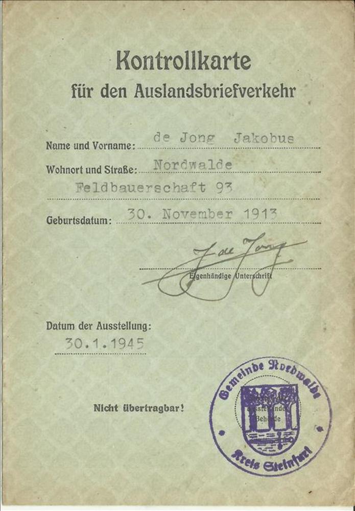 Kontrollkarte für den Auslandsbriefverkehr van Jacob...
