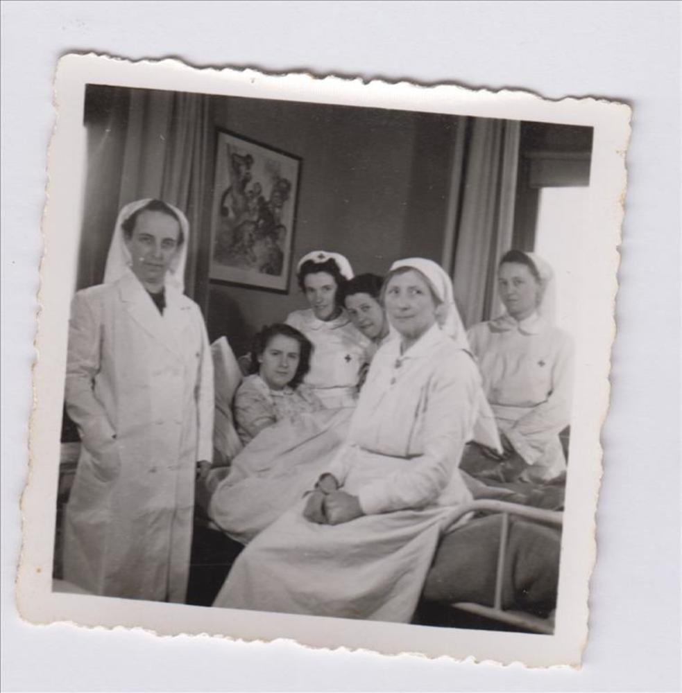 Foto van verpleegsters, bij het bed van een patiënte