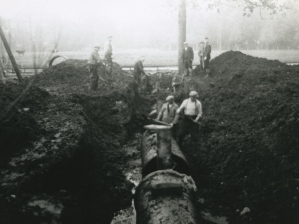Foto van acht werklieden in krater bij kapotte buis ...