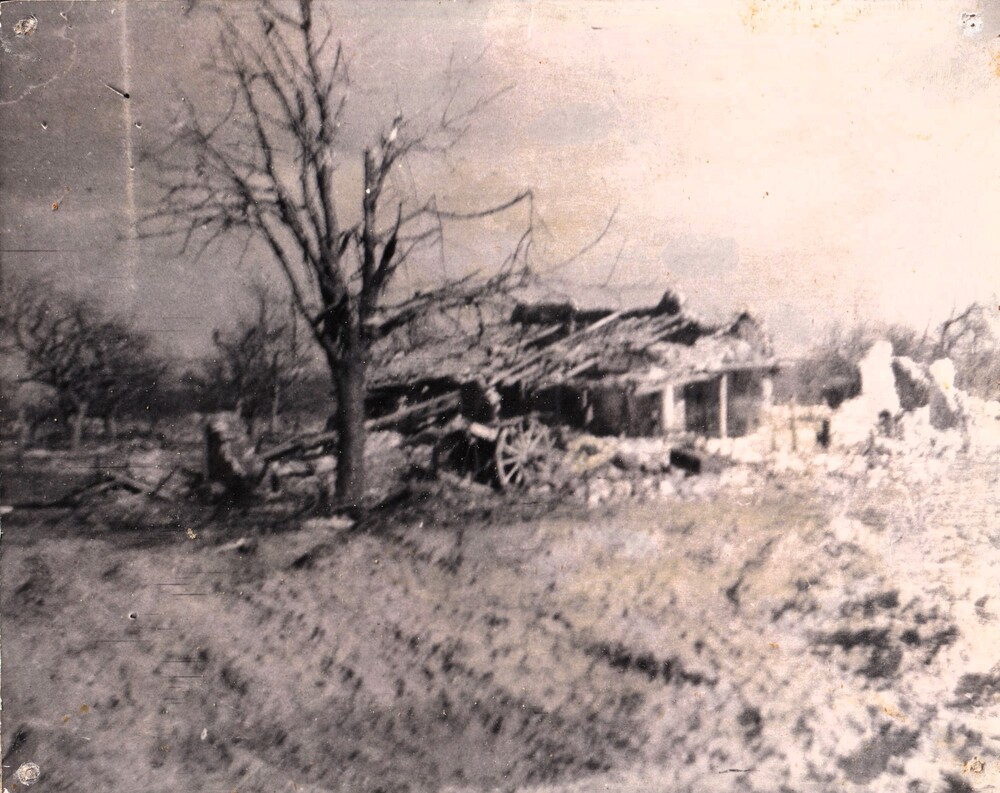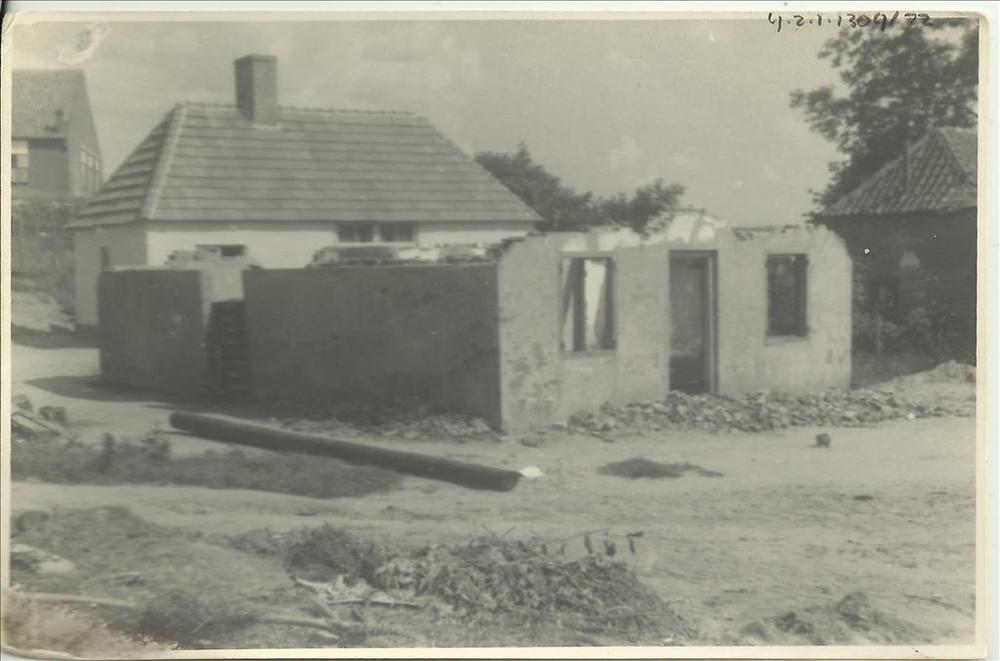vernielde boerderij, woonhuizen op achtergrond