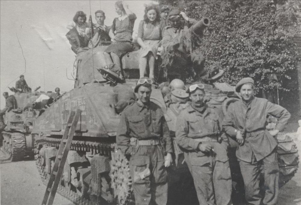 Britse tankbemanning poseert; kinderen op de tankkoepel