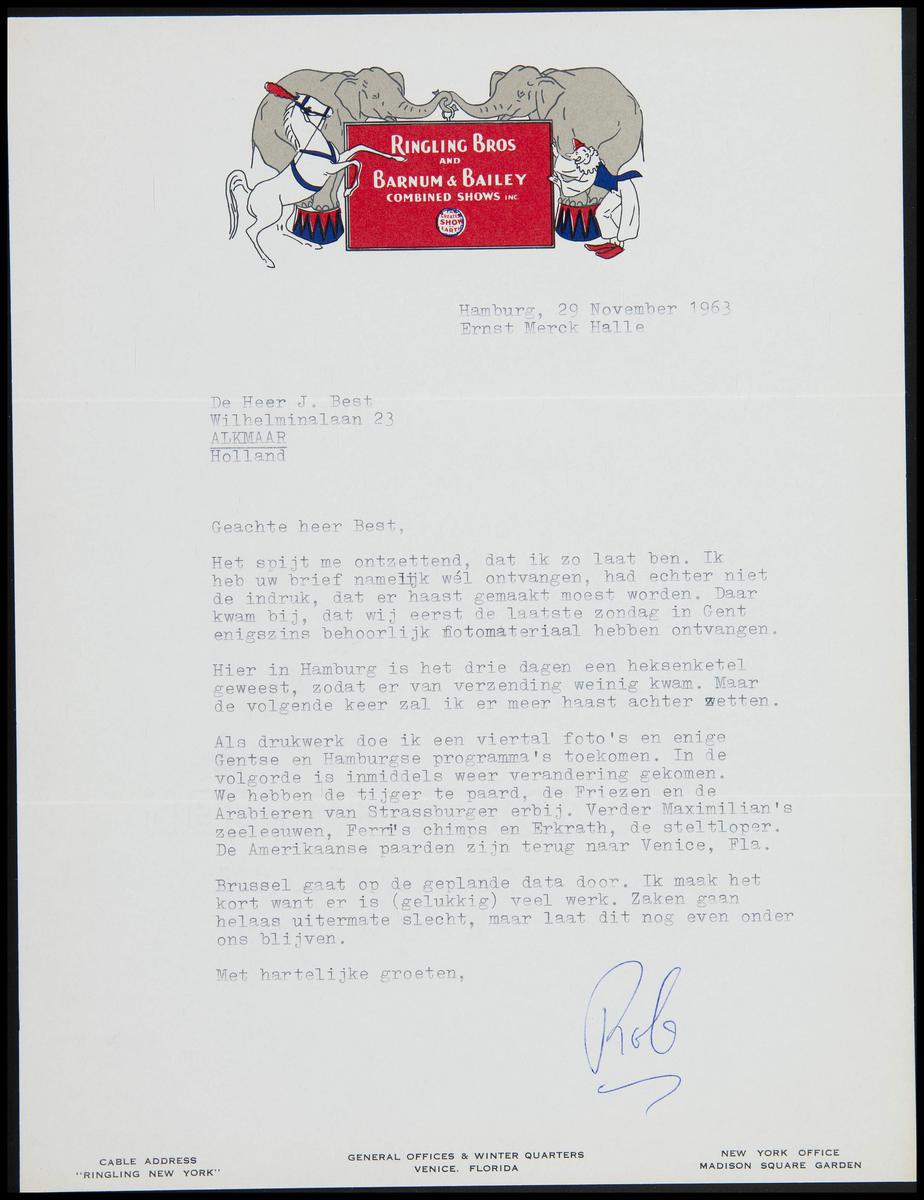 Brief Circus Ringling Barnum & Bailey aan Jaap Best