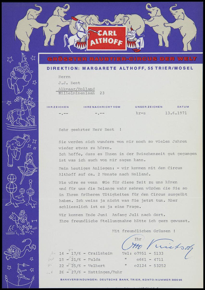 Brief Circus Carl Althoff aan Jaap Best