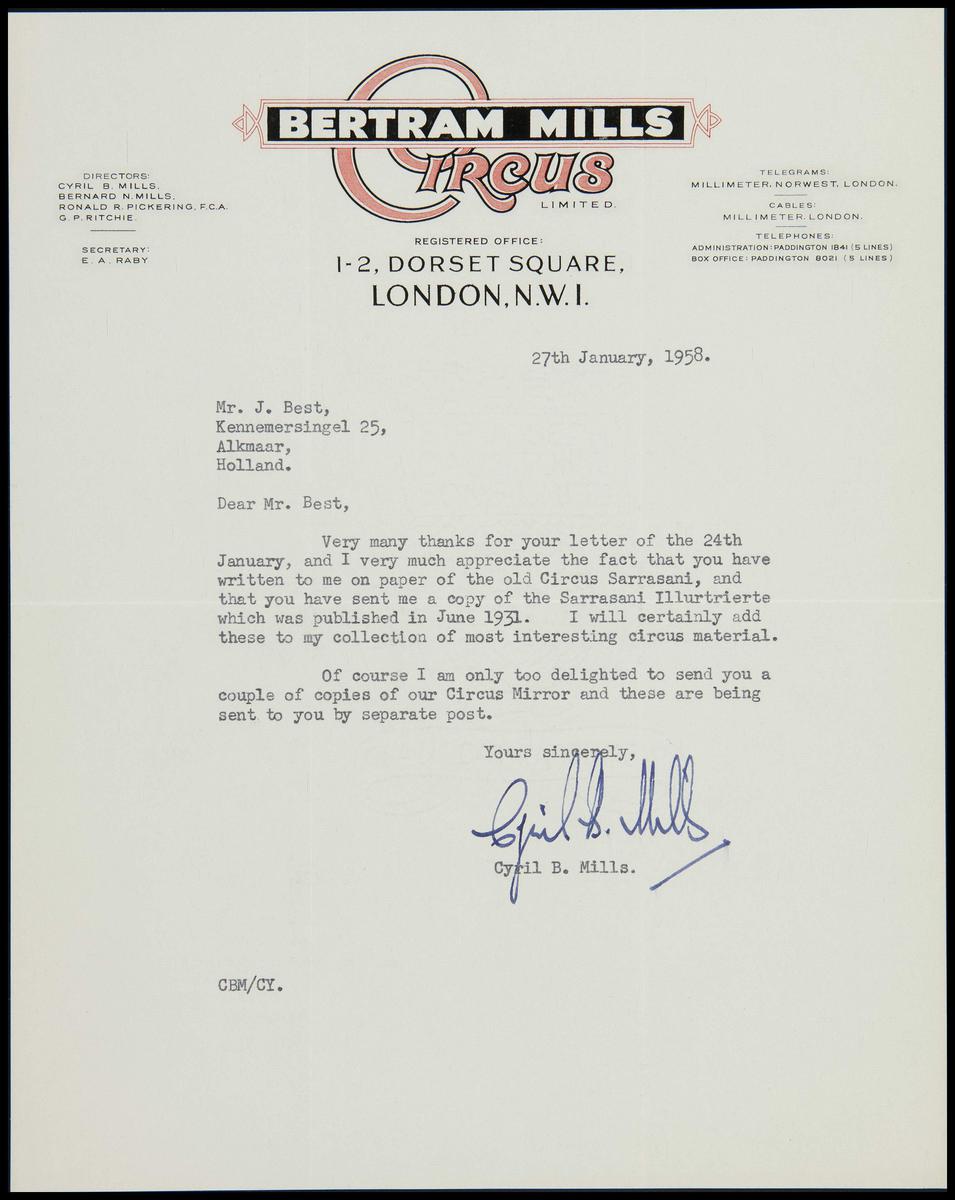 Brief Circus Betram Mills aan Jaap Best