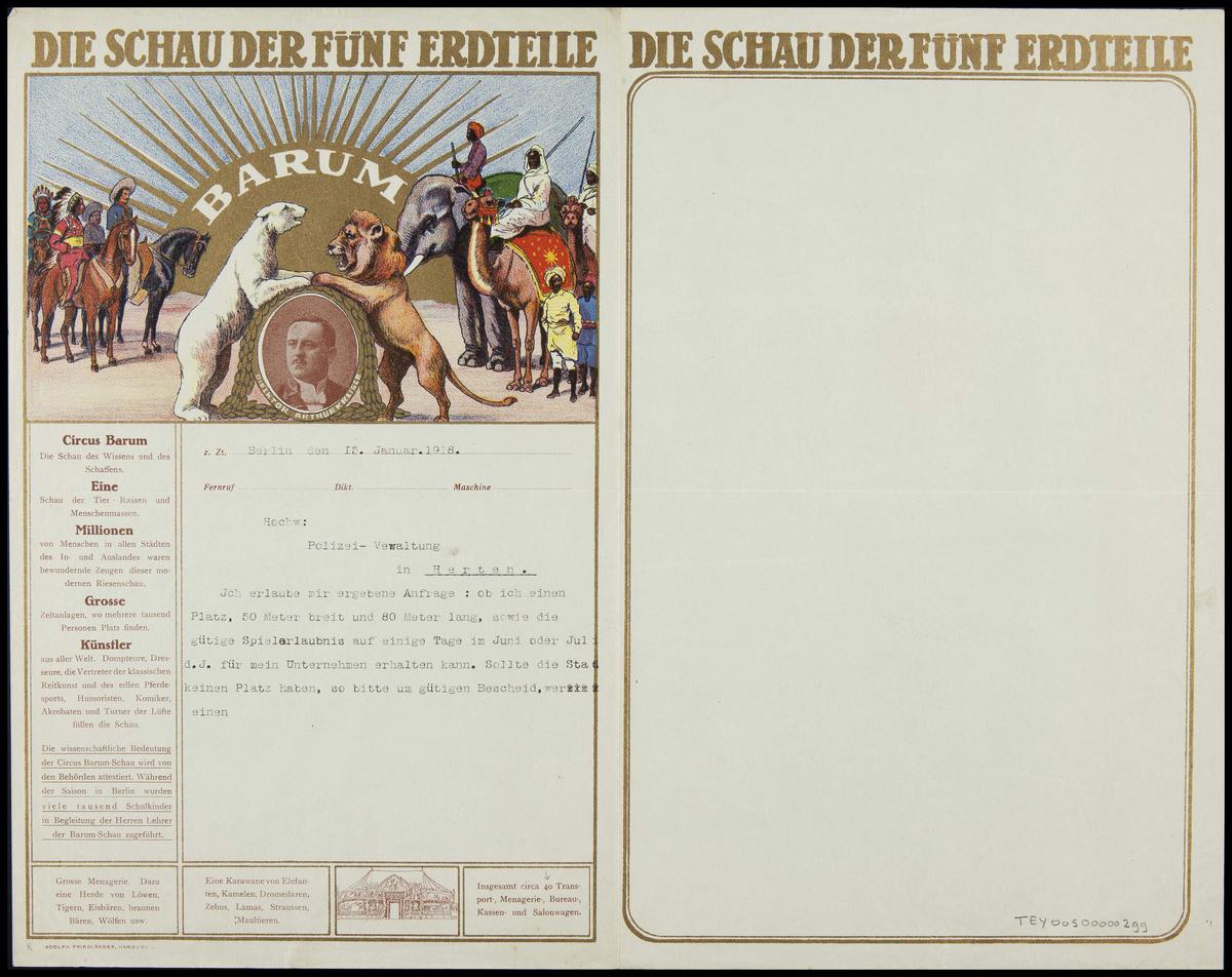 Brief Circus Barum aan politie inzake reservering st...
