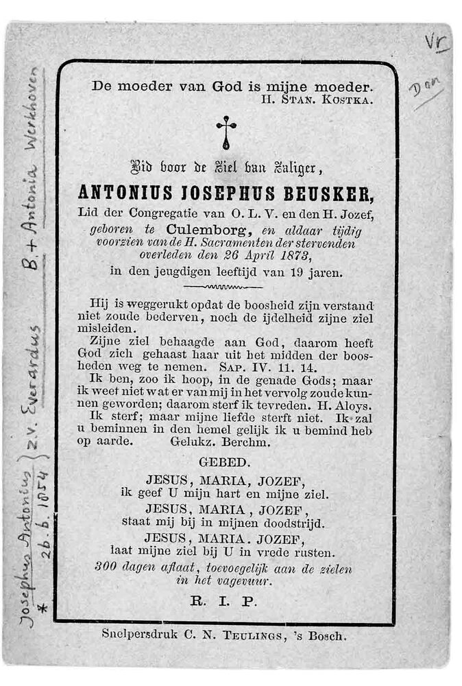 bidprent voor Antonius Josephus Beusker. Geboren 26-...