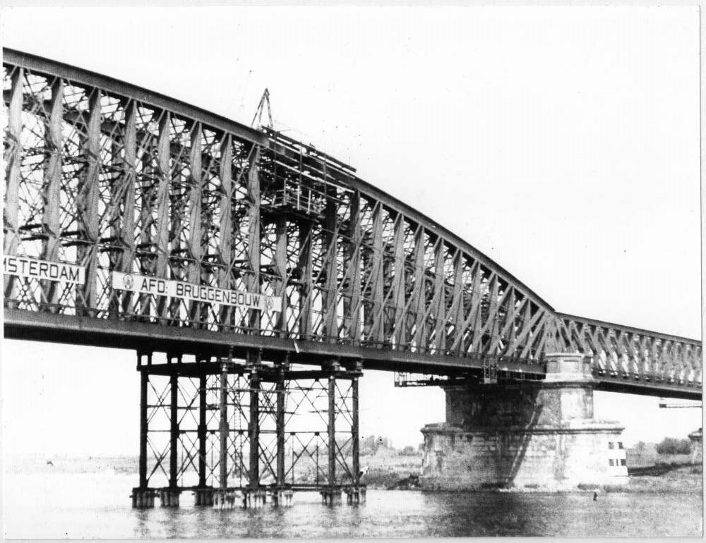 Foto, voorstellende reparatie bomschade aan de spoor...