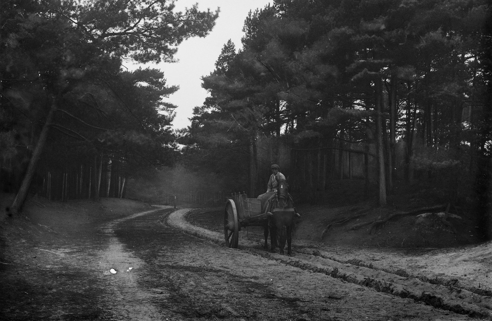 Een zandweg met karrespoor in een bos op de Veluwe