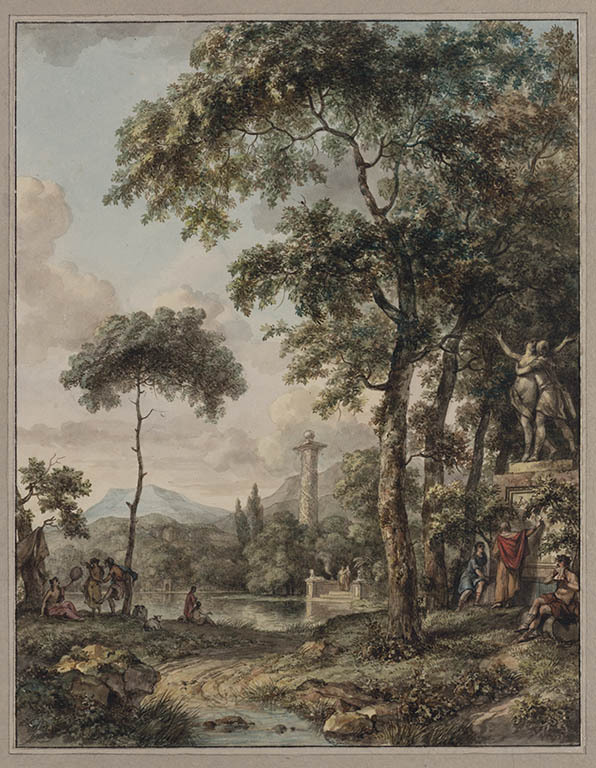 Arcadisch landschap met beeld van Apollo en Daphne
