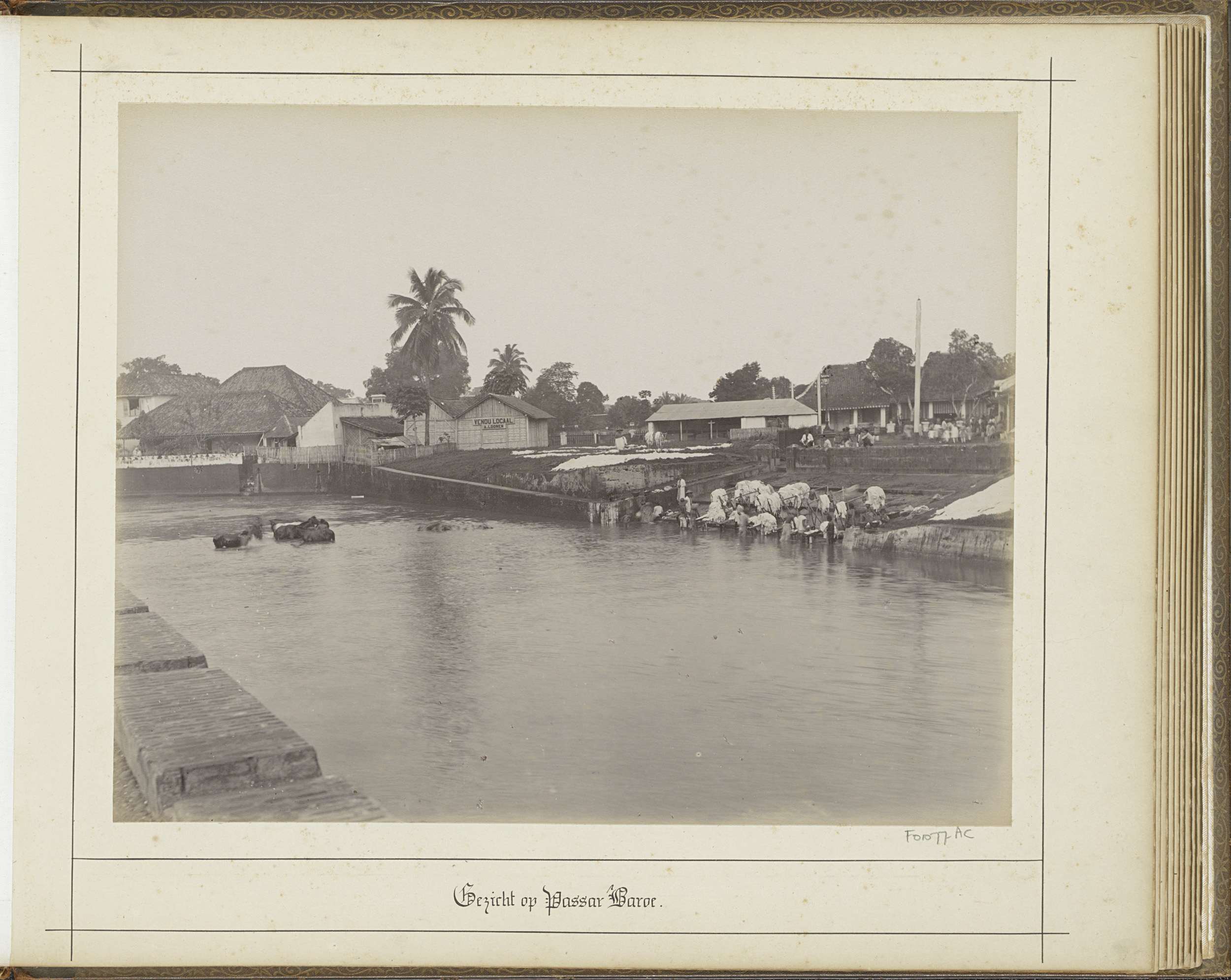 Paarden en wassers in Pasar Baru (Batavia) met op ac...