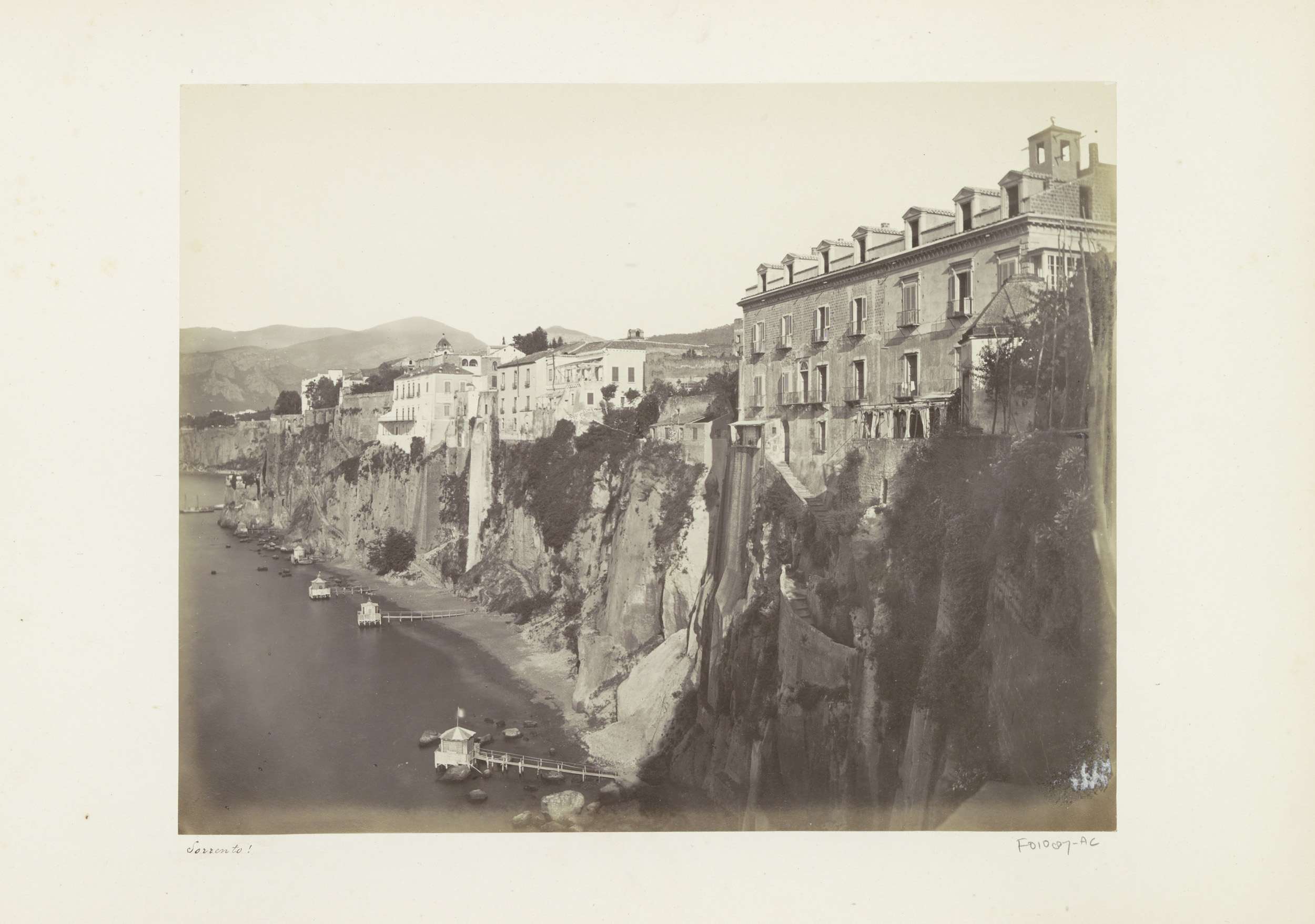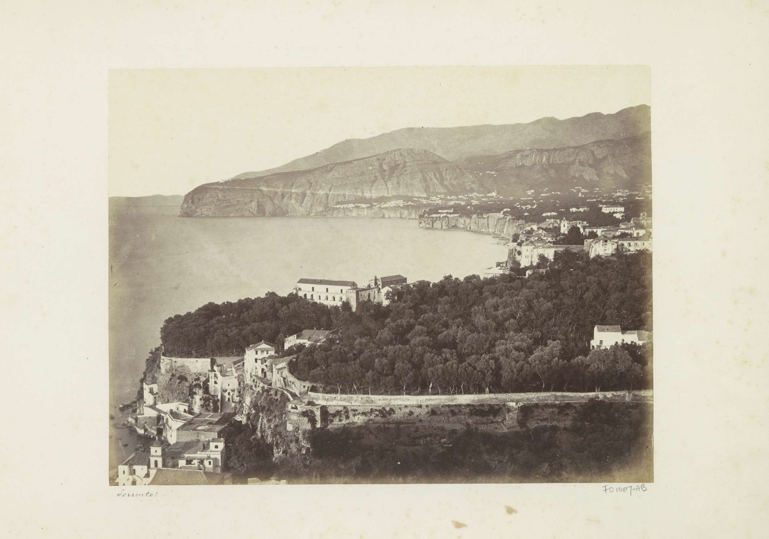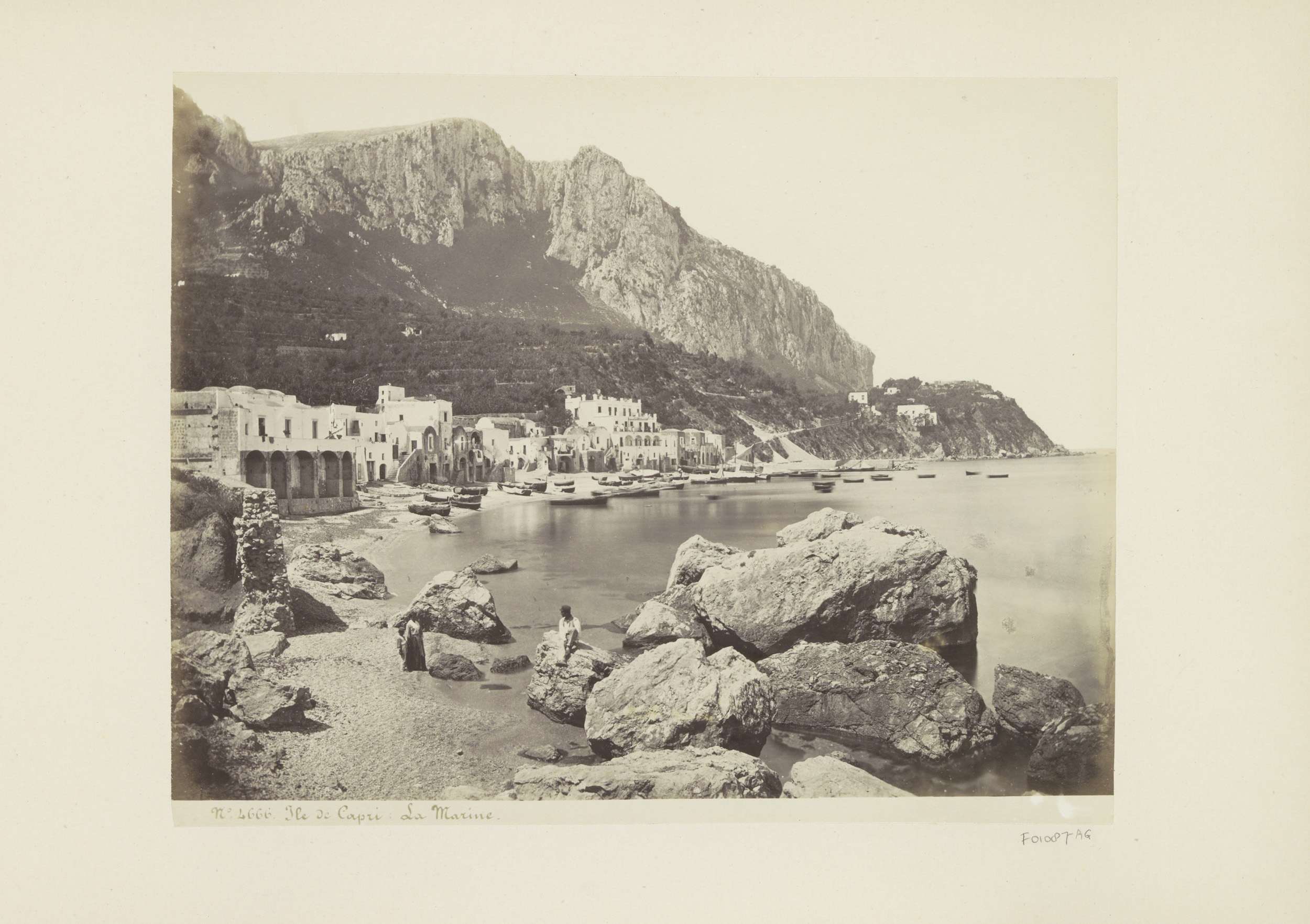 Twee vrouwen op een rots met uitzicht over een dorp ...