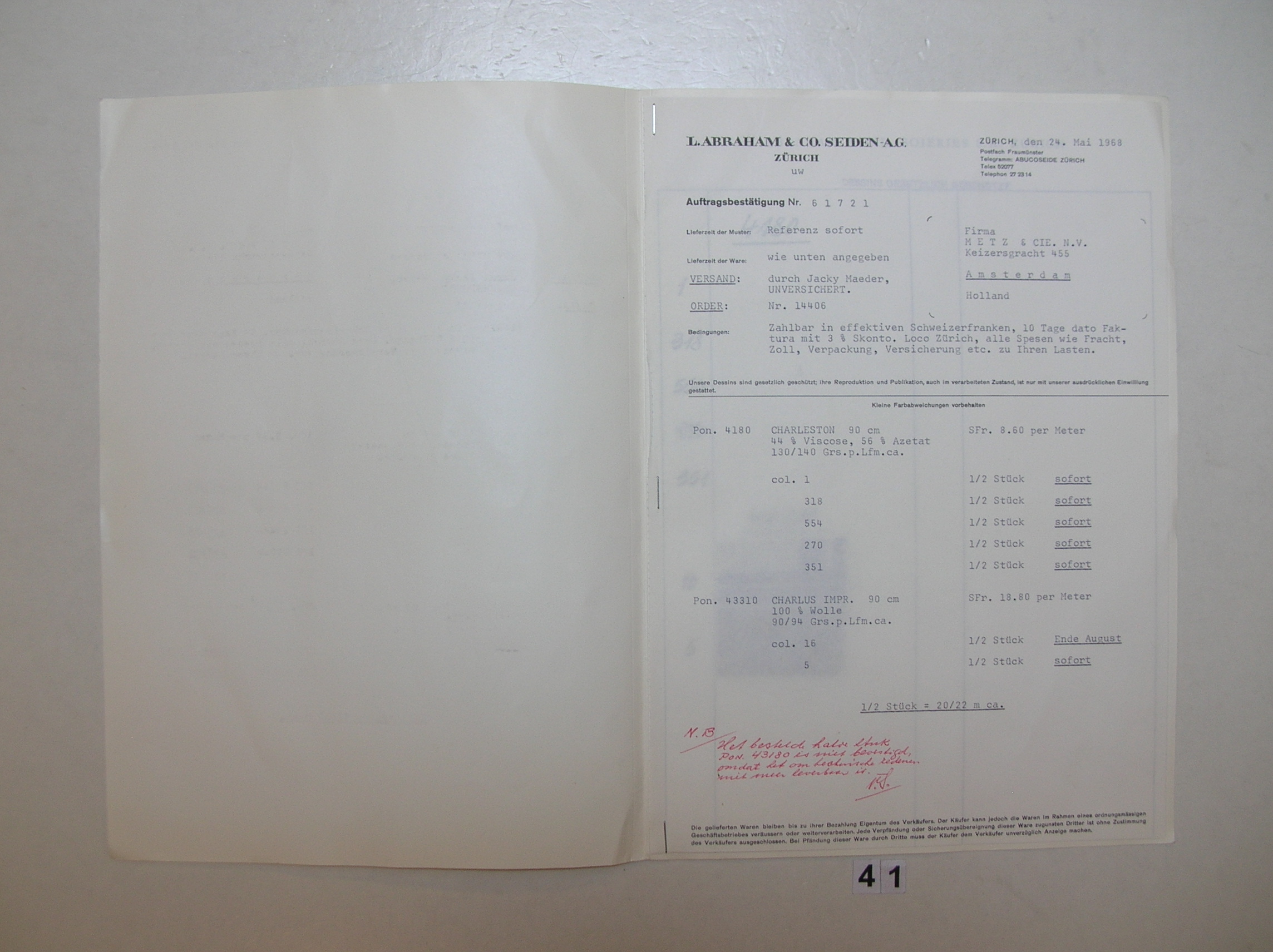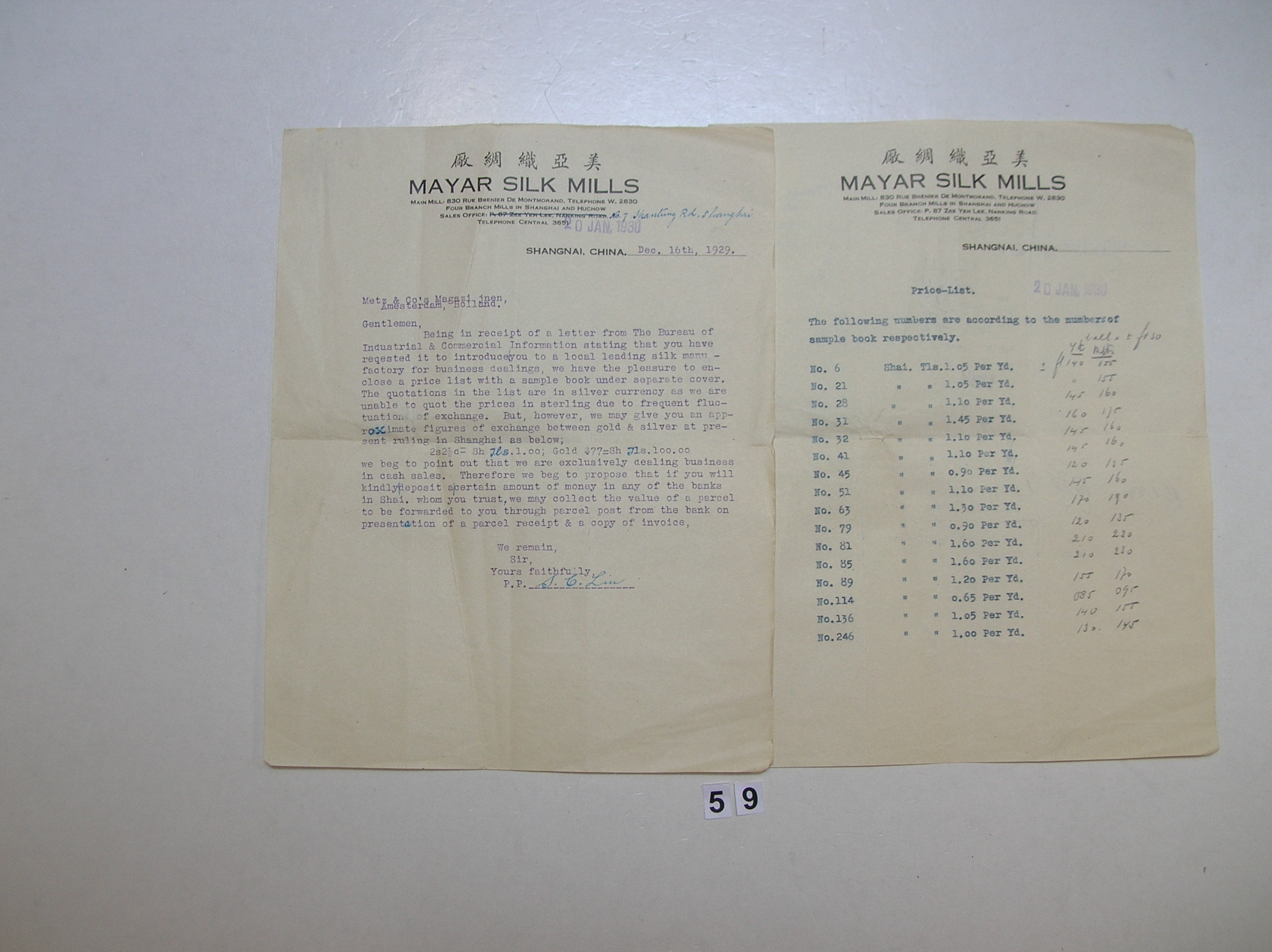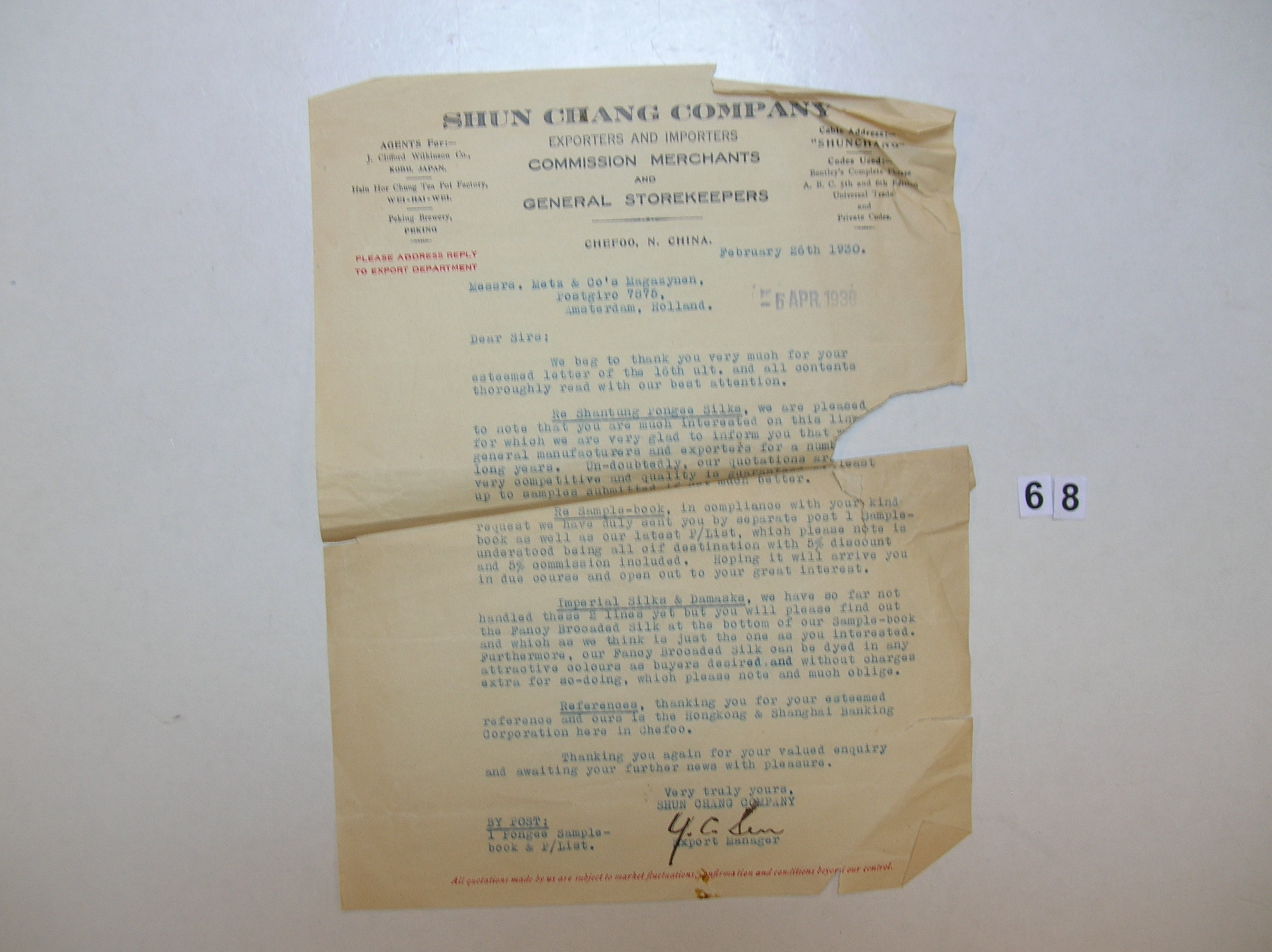 Briefwisseling Shun Chang Company met Metz & Co Maga...