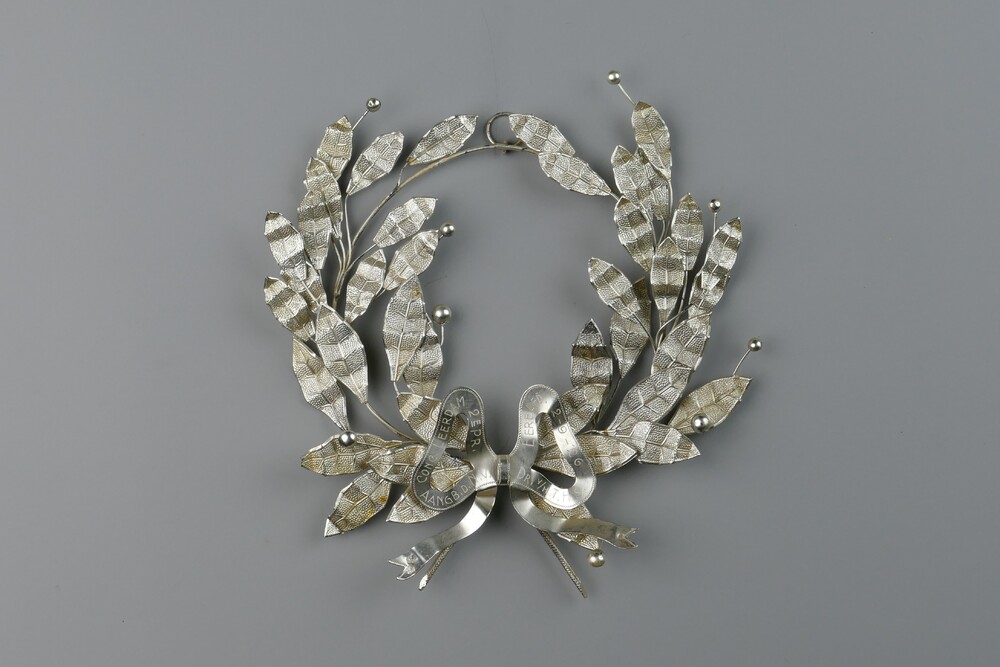 krans van zilverkleurig metaal, prijs uitgereikt aan...
