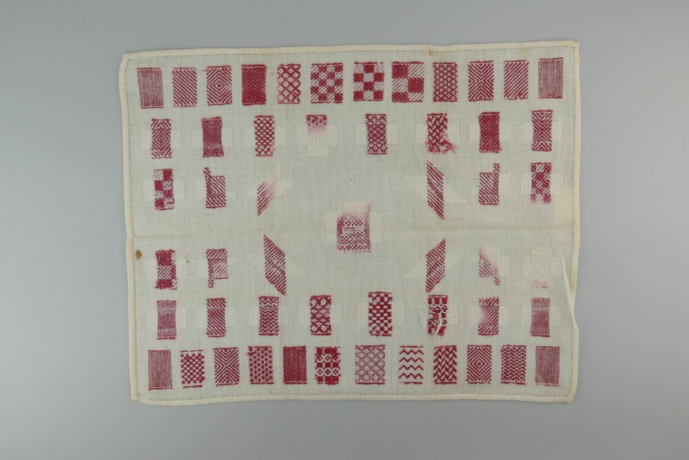 proeflap van kaasoek met stopwerk in rood garen, ver...