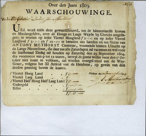 Waarschuwing, molengeld, 1803