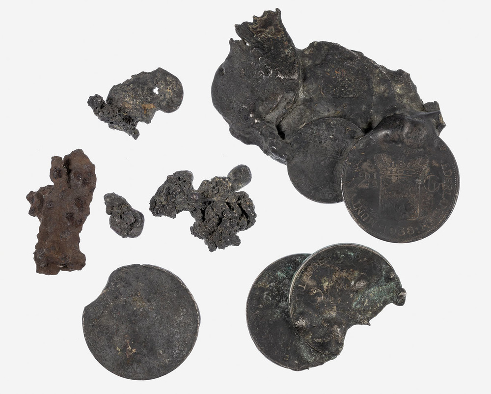 zes restanten van aan elkaar gesmolten zilveren rijk...