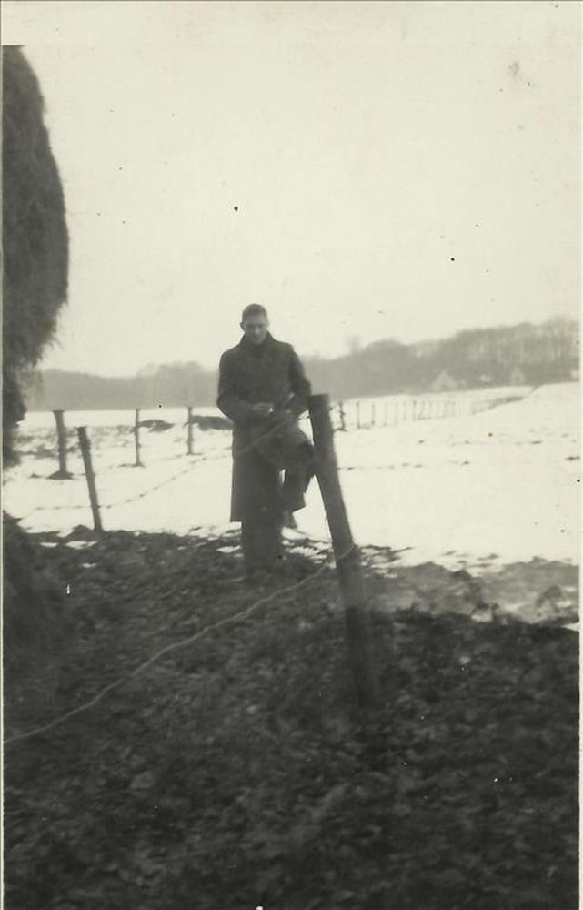 jongeman in burger bij een hooiberg met sneeuw op ac...